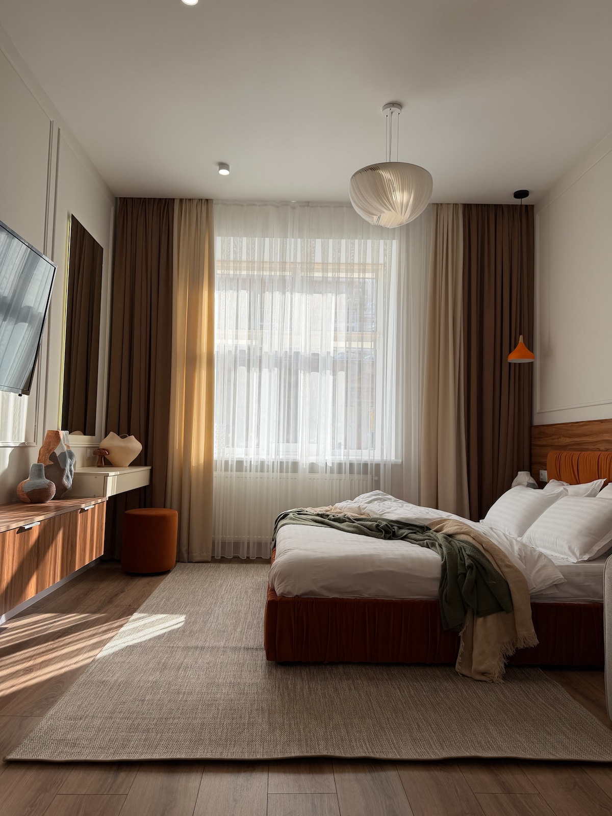 Íbúðin er í 8 mínútna göngufæri frá Óperuhúsinu og 10 mínútur frá Torginu og öllum sögulegum minnismerkjum. Auðvelt að komast frá stöðinni. Nálægt er verslunarmiðstöðin „Forum“, notaleg kaffihús, verslanir. Nútímaleg húsgögn, loftkæling, einstök hitun, hlýtt gólf á baðherberginu og eldhúsinu, hágæða pípulagnir, internet, inniskór, kaffi, te og allt sem þarf til að hafa það þægilegt. Í íbúðinni er hleðslustöð svo þú munt alltaf hafa ótruflað internet, ljós og hlaðna græjur.