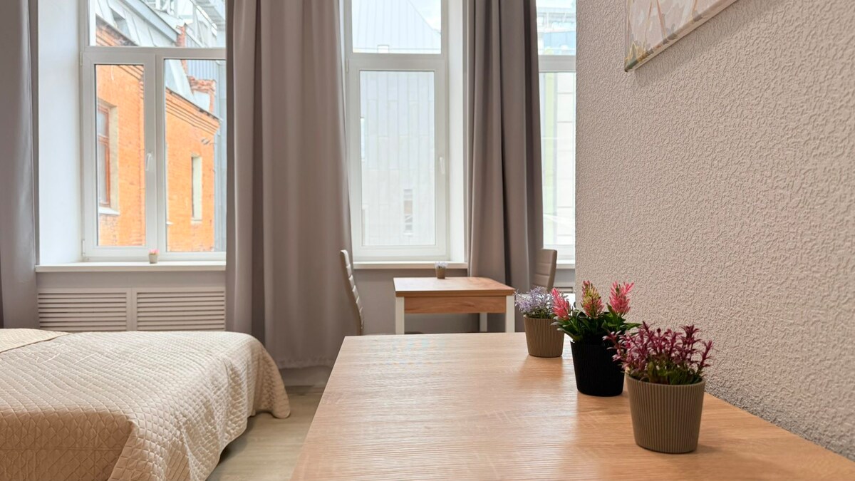 Þægilegt stúdíó í hjarta Kharkiv, á 3. hæð með lyftu. Hægt er að skipta rúminu í tvö aðskilin svefnpláss. Íbúðin er fullbúin fyrir þægilega dvöl: fullbúið eldhús, loftkæling, háhraðanettenging, þráðlaust net og þvottavél. Fullkomin staðsetning með kaffihúsum, veitingastöðum, matvöruverslunum, almenningsgörðum og Beketova og Istorychnyi Muzei-neðanjarðarlestarstöðvunum í aðeins 5 mínútna fjarlægð. Nálægt Nikolskyi-verslunarmiðstöðinni, Sitenko-sjúkrahúsinu, Mechnikov-stofnuninni!