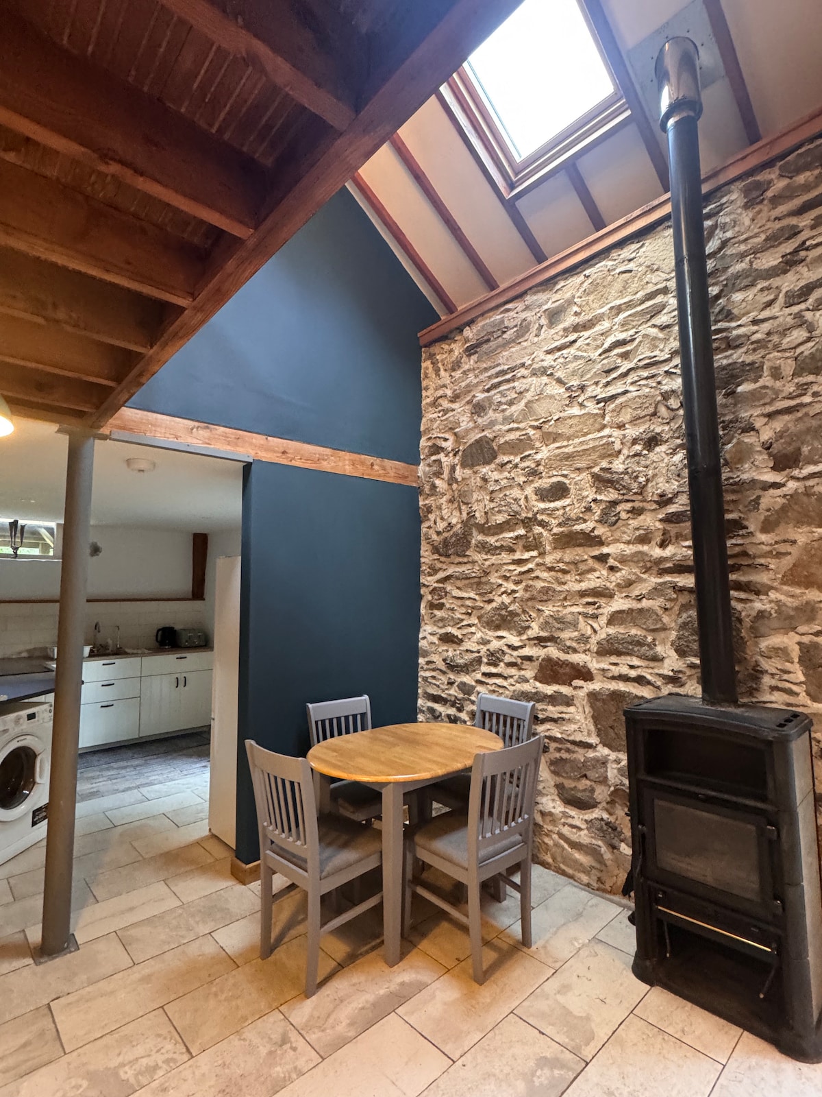 Fallegur, hefðbundinn steinhúsgerðar hlöður breytt í nútímalegt/iðnaðarleg/gróft lifandi rými með skemmtilegum snertingum. Hún er staðsett í friðsælum fjallsrætum Wicklowfjalla við Wicklow Way og býður upp á opið eldhús/stofu/borðstofurými, svefnherbergi á millihæð og rúmgóða rennibrautarherbergi. Viðbygging býður upp á auka stígvélherbergi/sveitalegt baðherbergi/salerni og steinlagðan garð. Svæðið samanstendur af efri og neðri grasflötum sem eru staðsettir á hálfum hektara. Sveitakrá er í göngufæri.