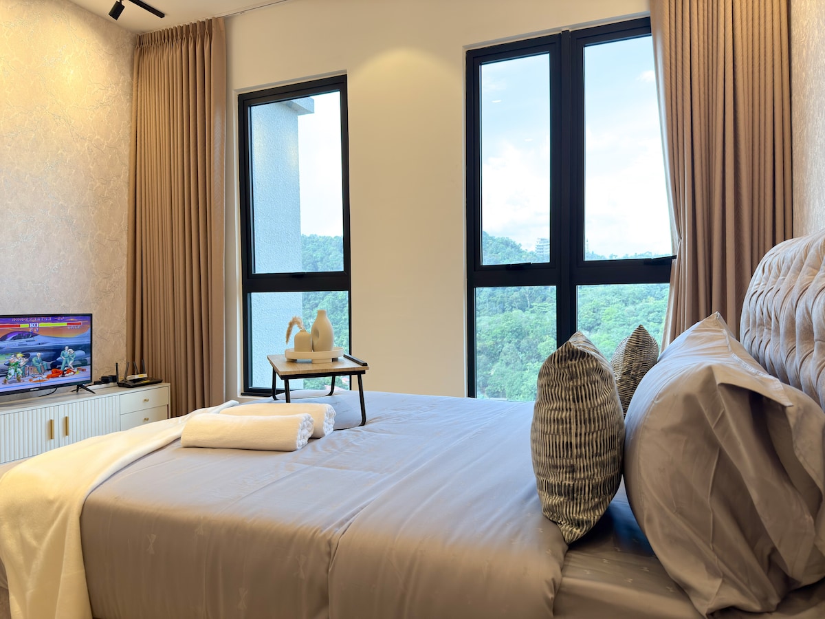 Fyrsta flokks einingin okkar, notaleg heimagisting, er staðsett í CBD og Gullna þríhyrningnum. Býður upp á magnað útsýni frá hinni verðlaunuðu sundlaug á 51. hæð og er umkringd öllum táknrænum turnum Malasíu, þar á meðal KLCC, KL-turninum, Tun Razak Exchange og Warisan Merdeka-turninum. Það er þægilega staðsett í 100 metra fjarlægð frá Conlay MRT-stöðinni, 1 km frá Pavilion Mall, KLCC, TRX og mörgum öðrum vinsælum stöðum í KL. Að auki eru margir valkostir fyrir afhendingu máltíða allan sólarhringinn.