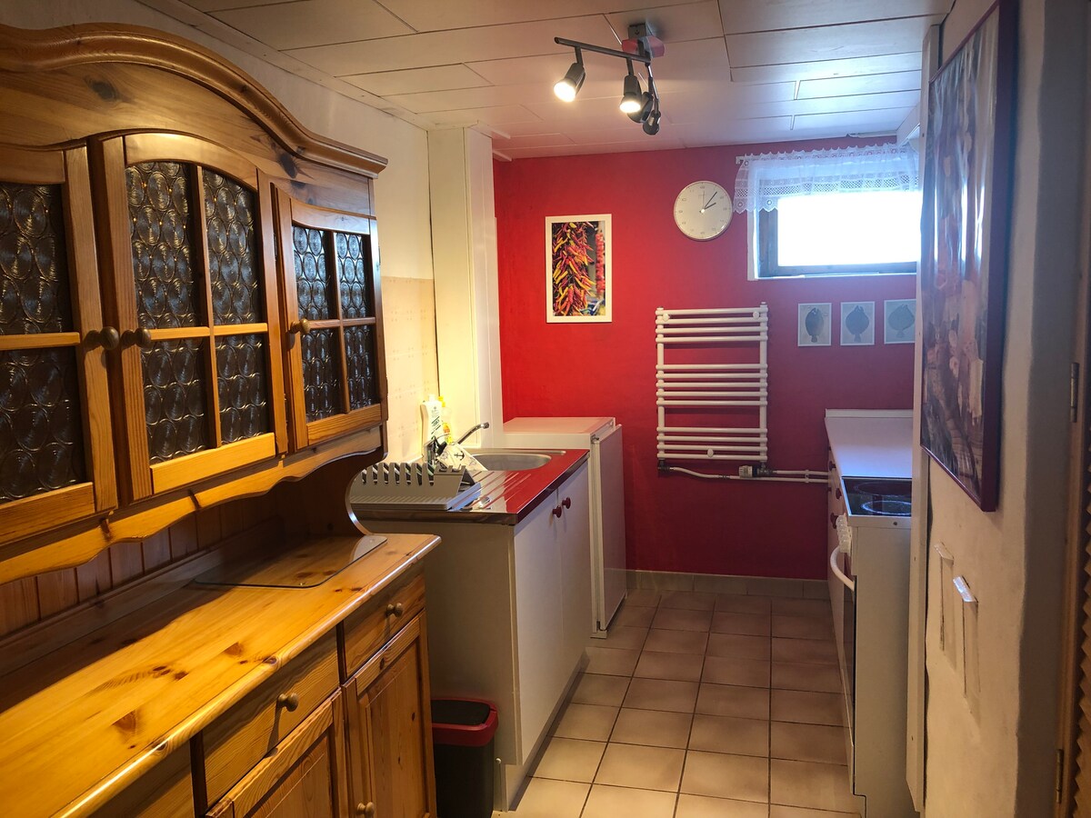 Íbúðin er í kjallaranum og þar er stórt svefnherbergi/stofa þar sem annar einstaklingur getur sofið í dívan eða gestadýnu, aðskilinni borðstofu og fullbúnu eldhúsi ásamt baðherbergi með salerni, baðkeri, sturtu og boðbúnaði. Hægt er að komast að meistarahúsunum fótgangandi á um það bil 15 mínútum (1 km) og Bauhaus á um það bil 25 mínútum (2 km). Stæði fyrir framan húsið og geymslurými fyrir reiðhjól eru til staðar.