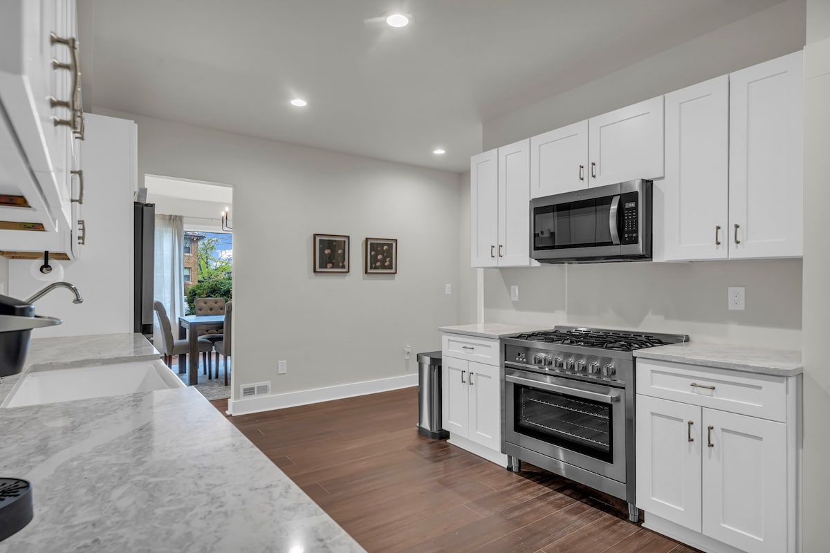 Detroit's premier executive retreat with a fun pizza theme near LCA! Hér er skrifborð, vinnuvistfræðileg uppsetning, prentari, 2 queen-rúm, samanbrotinn sófi, rafmagnsarinn, inniskór með Detroit-þema, eldhúsinnrétting, kaffistöð, fröken Pac-Man og Galaga spilakassi. Sérinngangur, aðliggjandi bílskúr, svefnherbergi á jarðhæð með ½ baðherbergi, steinsnar frá LCA, Fox Theatre, Ford Field, Comerica Park og Q Line í nágrenninu. Harðviðargólf, nýtt teppi, ryðfrí tæki, þvottavél/þurrkari og inngangur að talnaborði. Bókaðu núna!