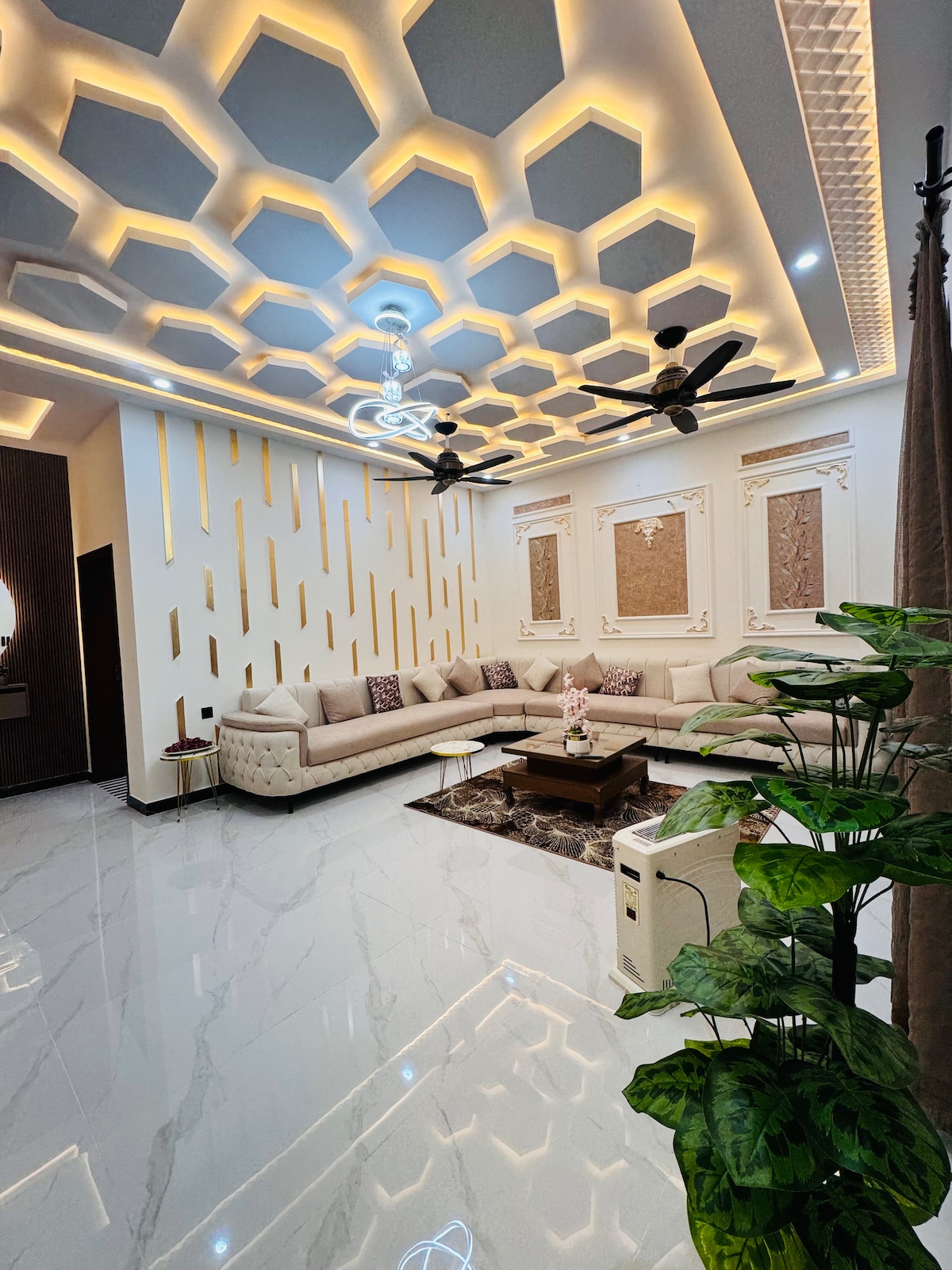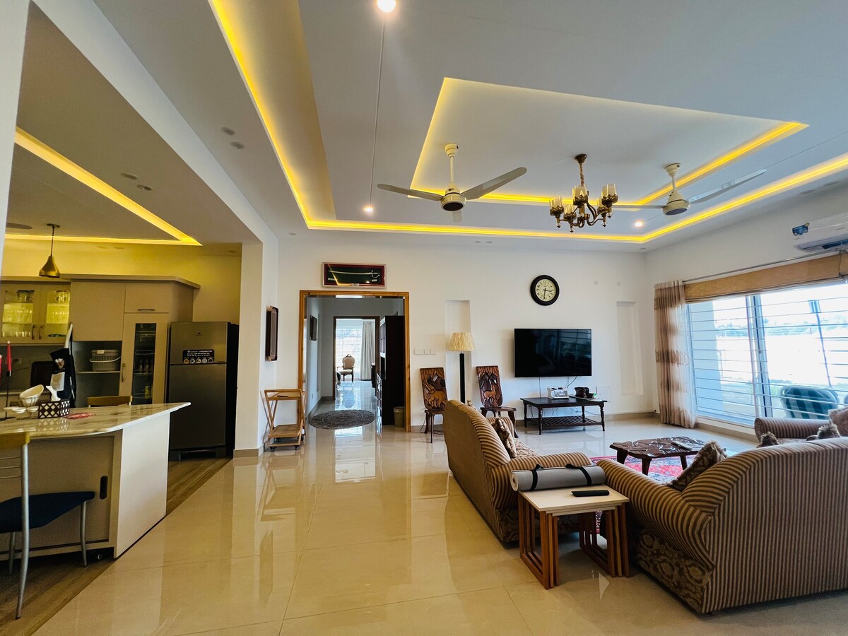 Verið velkomin í glæsilegu tveggja svefnherbergja svíturnar okkar í DHA 5 Islamabad. Njóttu þess að ferðast hratt og slakaðu á í rými með fallegum innréttingum og fullbúnu heimabíói. Þetta notalega afdrep er tilvalið fyrir ferðamenn sem vilja þægindi og afþreyingu og býður upp á nútímaleg þægindi á góðum stað. Þetta er algjör aðskilinn hluti með aðskildum inngangi og bílastæði, fjölskylduvænn og því mjög öruggur og friðsæll. Ekki er leyfilegt að halda veislur og hlusta á háværa tónlist. Ógift pör eru ekki leyfð.