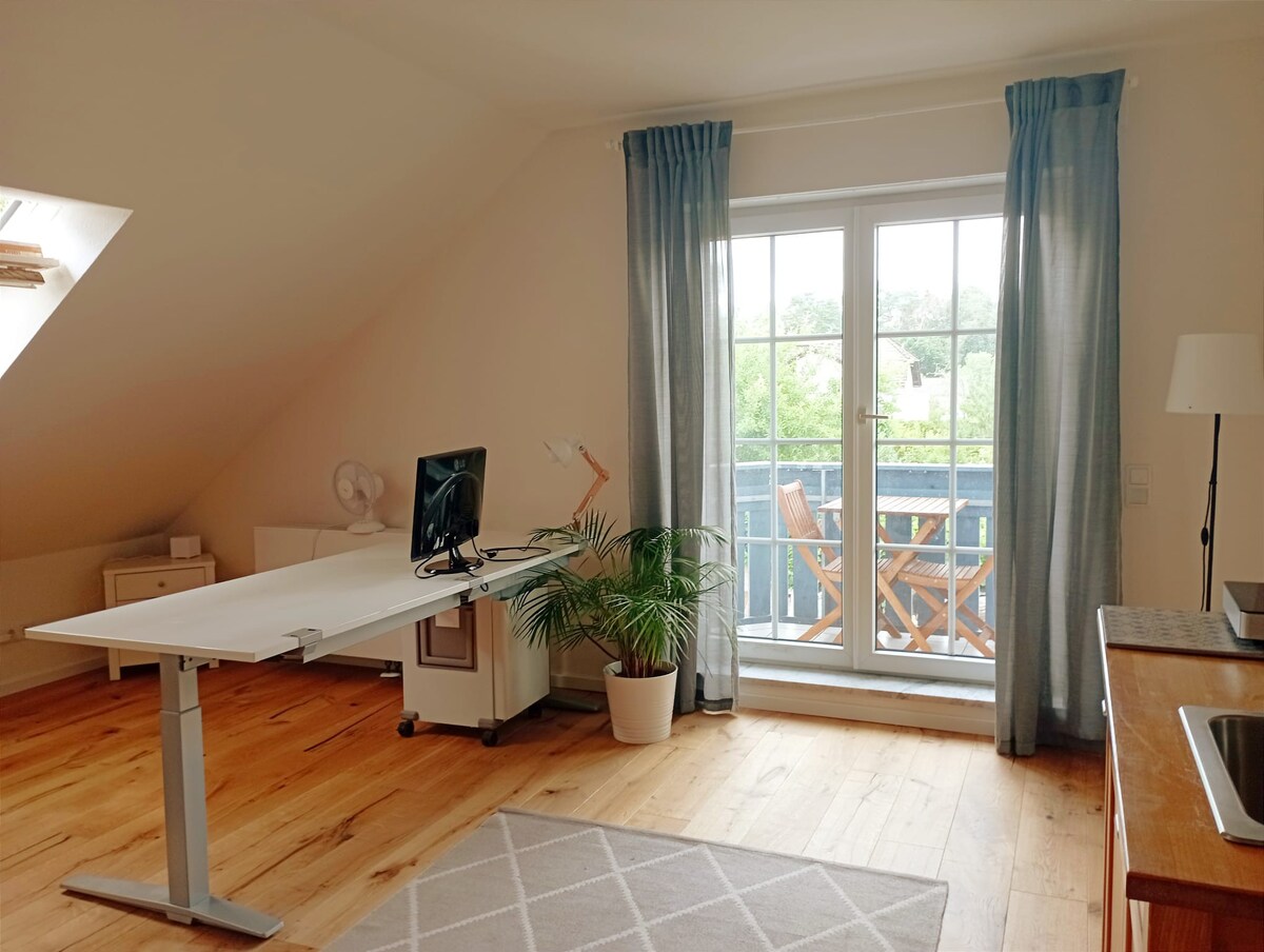 Íbúðin er aðskilin með húsagarði frá aðalhúsinu og samanstendur af þremur hæðum í umbreyttri hlöðu. Á miðhæðinni er baðherbergi og eldhúshorn og undirdýna í queen-stærð. Hægt er að komast í gallerí með hjónarúmi í bröttum stiga. Inngangurinn (neðri hæð) er staðsettur með glerhlið sem snýr að garðinum. Baðherbergið, eldhúsið og galleríið eru með glugga út í garð. 6 mín. ganga til S-Bahn til Frankfurt (um 30 mín. til borgarinnar), góð tenging við A3. Z.Zt. 2G!