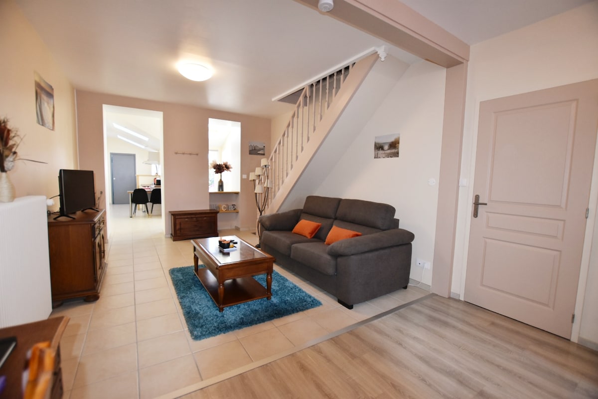 Notre maison comprend deux logements distincts de 75m2 dont l'un constitue notre résidence principale, l'autre est affecté à la location de tourisme. Au RDC, une salle salon 35m2, canapé convertible, cuisine aménagée très lumineuse et une SDB douche à l'italienne. A l'étage une chambre avec SDB attenante, baignoire, WC séparés. Les draps, serviettes de toilette sont fournis, lits faits. Maison dans un environnement très calme et éloignée de la route. Stationnement dans la cour de la maison.