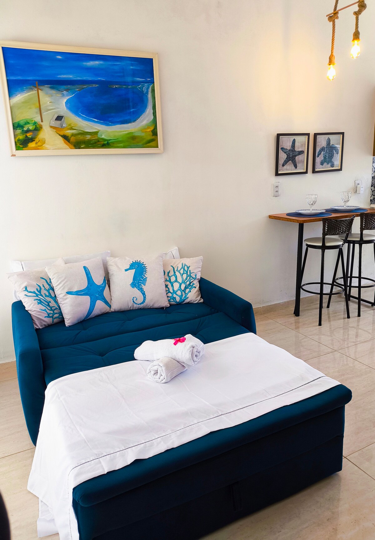 Relaxe à apenas 150 metros da praia em uma casa confortável, com suíte climatizada com ar-condicionado, sala aconchegante com sofá-cama, cozinha completa, área externa com Lounge, chuveiro e jardim, bem como garagem privativa, garantindo comodidade e segurança durante toda a estadia. Tudo isso com uma decoração náutica cheia de estilo! A localização é um dos grandes destaques: você estará a poucos passos do mar, podendo ir caminhando tranquilamente.