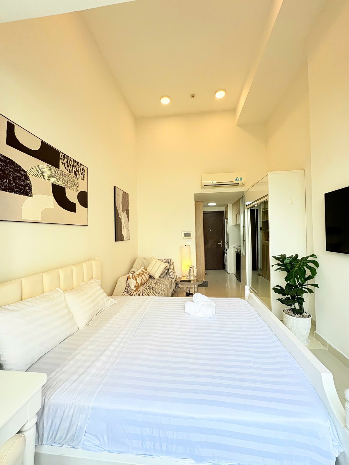 Í byggingunni er stór sundlaug með opnu útsýni og grænn garður sem skapar mjög tilkomumikið rými. Það besta sem hægt er að gera er að njóta sólsetursins í forgrunninum þar sem hægt er að sjá Saígon-ána renna um og sólin er smám saman að minnka til að skapa fallega liti. Þetta stúdíó býður upp á margar upplifanir til að finna óvæntar uppákomur á heimili sem henta mjög vel fyrir afmælisveislur, einkafundi, óvæntar uppákomur, afmælisdvöl, skrifborð, ferðagistingu, frí og fleira!
