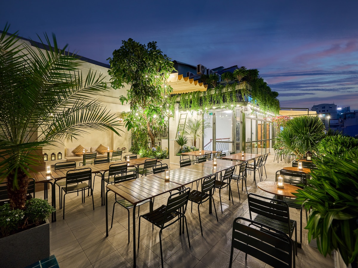 Welcome to our hidden rooftop oasis in District 1, HCMC! As you ascend to this serene haven, you'll be greeted by a tastefully decorated space, thoughtfully designed to whisk you away from the city's hustle and bustle. The private rooftop is adorned with unique touches, boasting a chic outdoor stone bathtub, inviting you to unwind under the open sky. Imagine soaking in warm water, surrounded by the sights and sounds of the vibrant city below - it's an experience like no other redefined!