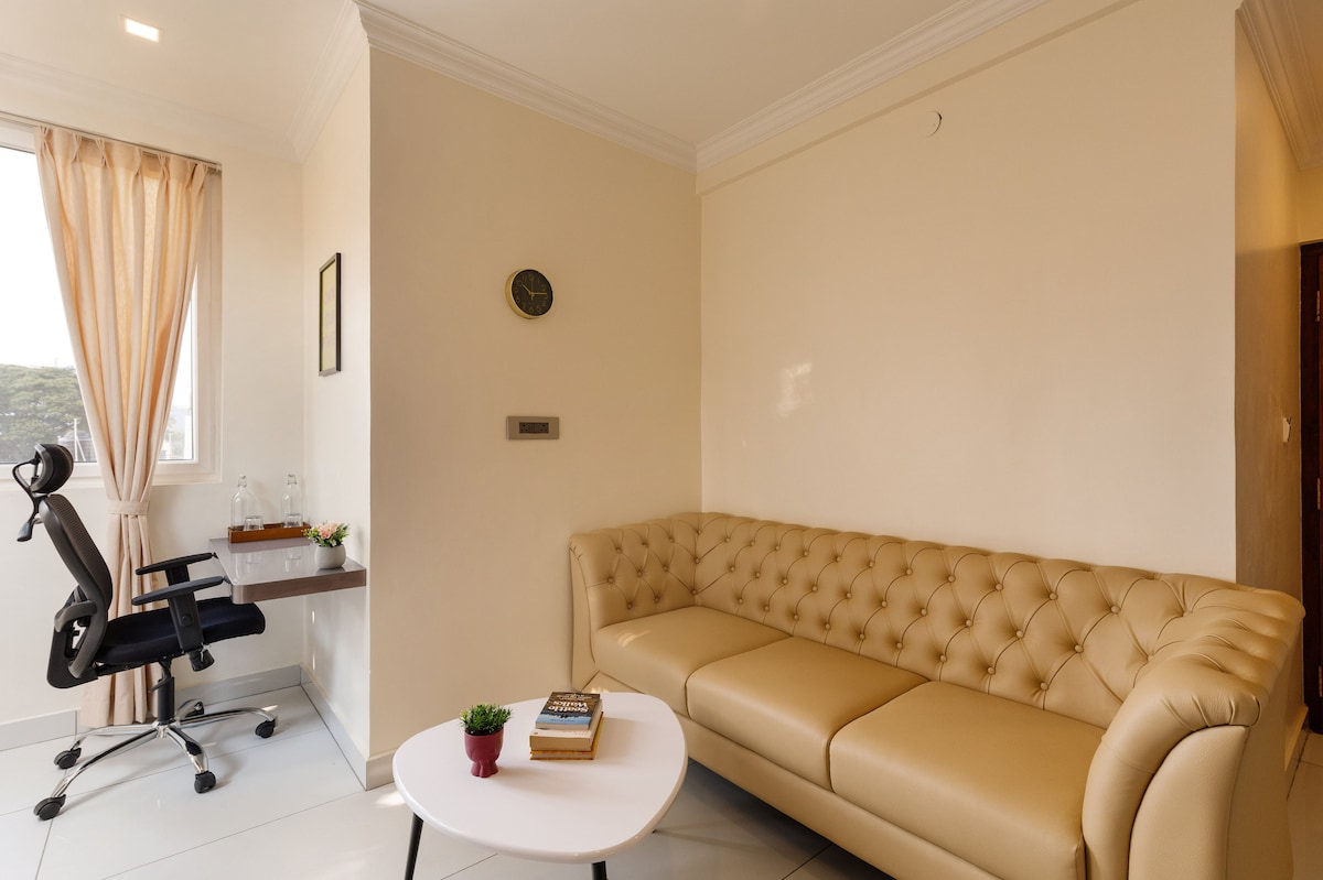 A calming, design-led studio in soft sage tones with fast WiFi, a dedicated desk, and a compact kitchenette for light cooking. Located near Indiranagar in a quiet residential lane, yet well-connected to Koramangala, cafes, and nightlife. Just minutes from Embassy Golf Links and Manipal Hospital. Fully private, thoughtfully equipped, and designed to feel serene and homelike. Kindly check the ‘Other things to note’ section for temporary updates before booking.
