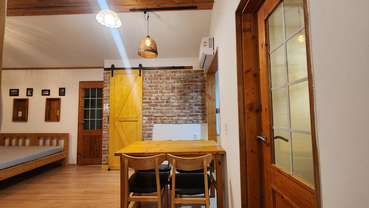 Þetta ekta Jeju steinhús (Hanok-stíll) var byggt árið 1866 og hefur verið gert upp með öllum nútímaþægindum. Þetta er tilvalinn staður fyrir þig til að njóta ósvikins eyjalífsstíls. Hann er staðsettur á Olle-stíg nr. 20, í aðeins 3 mínútna akstursfjarlægð frá Gimnyeong-ströndinni. Þetta heilunarafdrep veitir þér einkaaðgang að einkahúsi (Ankkeori, húsagarði) og heitum potti utandyra. Þú munt hafa aðgang að garði og aðskildu eldhúsi. Ókeypis bílastæði við götuna. Roberta/Youngsoo