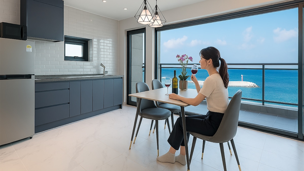 Falleg náttúra Yeongrang-vatns verður í stofunni og á veröndinni. Það er í 10 mínútna göngufjarlægð svo að þú getur notið bæði sjávarins og vatnsins. Það er einnig staðsett ekki langt frá Dongmyeong Port, Yeonggeumjeong og Intercity Bus Terminal. Dularfulla lýsingin mun bæta við andrúmsloft næturinnar og láta tímann skína enn meira. Nútímalegar innréttingar í snyrtilegum hvítum tónum hreinsa svimandi hugsanir daglegs lífs og einbeita sér meira að þessum tíma hér. Ég skildi ekki eftir sjónvarp í stofunni svo að ég gæti fyllt það með ykkur tveimur. Þess í stað getur þú notið og notið Netflix, YouTube o.s.frv. með stórum bjálkaskjá sem er ekki öfundsjúkur af kvikmyndahúsinu í svefnherberginu. Svefnherbergið var eins þægilega og mögulegt var með lítilli lýsingu til að hjálpa til við mikla kvikmyndaskoðun og djúpsvefn. Mælt með fyrir þá sem ferðast einir eða með tveimur einstaklingum.