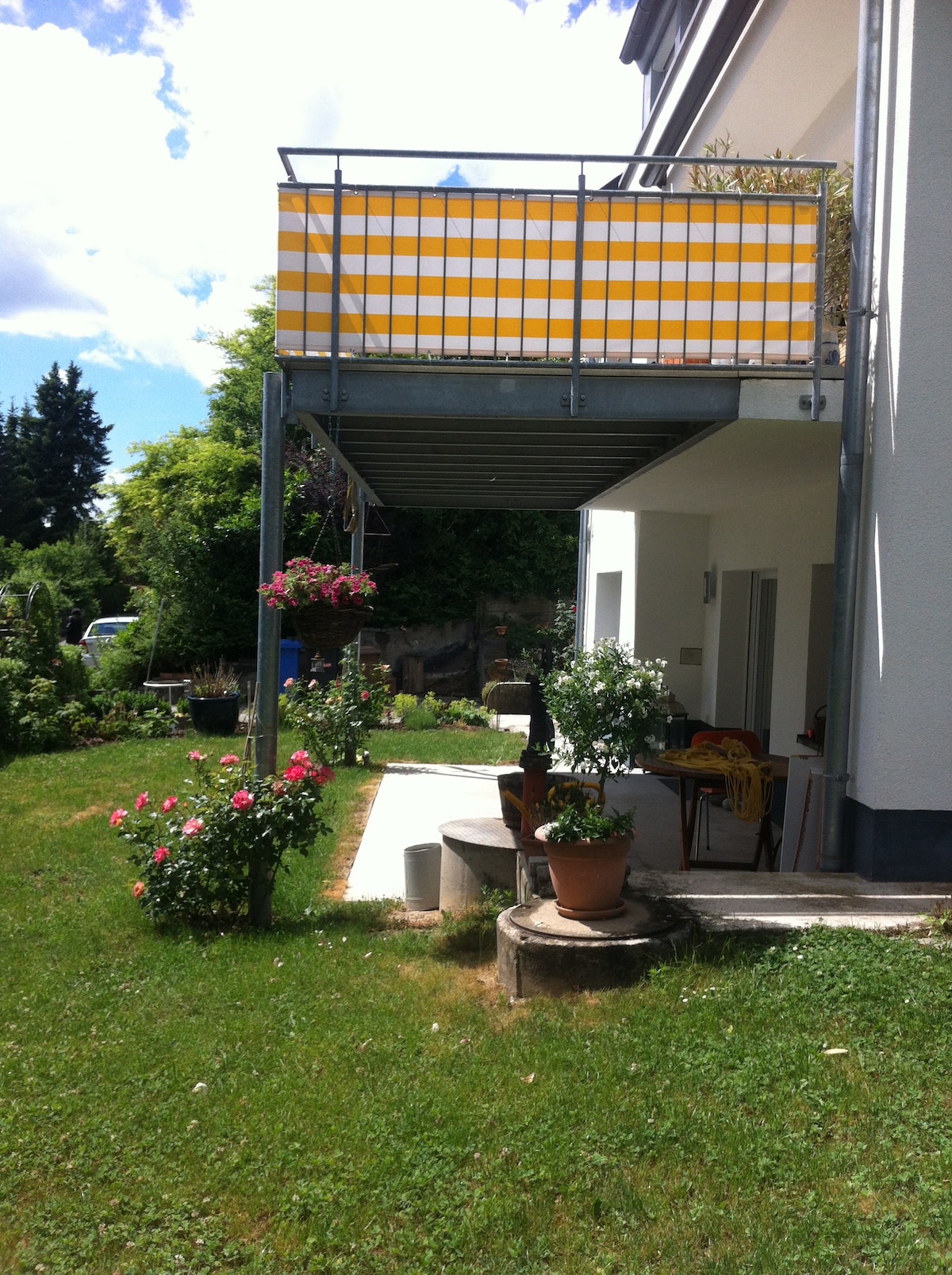 Gestir okkar eru með eigin íbúð en hún er aðeins leigð út til eins aðila. Það er með tveimur hjónarúmum og einu rúmi. Barnarúm sé þess óskað. Íbúðin er á 2. hæð og er aðgengileg í gegnum stiga (engin lyfta) en mjög hljóðlát og með frábæru útsýni yfir Munot, Rín og Schaffhausen. Hægt er að komast fótgangandi til borgarinnar Schaffhausen á 10 mínútum. Við útvegum bílastæði fyrir bílinn þinn. Stórar þaksvalir fyrir sólböð án truflunar.