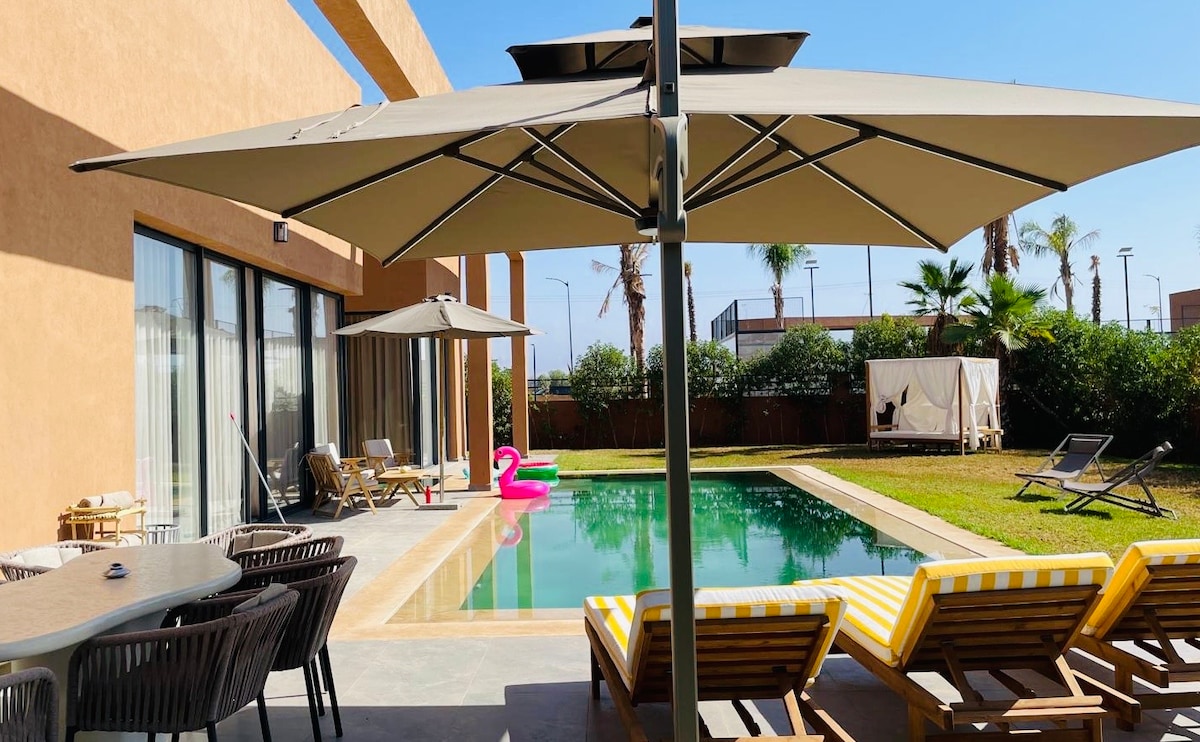 Stígðu inn í lúxus 3BR 3.5Bath villuna í fremsta Samanah-golfklúbbnum! Það býður upp á afslappandi frí á 18 holu faglega vellinum nálægt mörgum spennandi stöðum í Marrakech og sögulegum kennileitum. Stílhrein hönnun, magnaður garður og ríkulegur þægindalisti vekur hrifningu þína. ✔ Fallegt útsýni ✔ Dagleg þrif + kokkaþjónusta ✔ Þrjú svefnherbergi + baðherbergi með sérbaðherbergi ✔ Þægileg stofa ✔ Fullbúið eldhús ✔ Garður (sundlaug, Pergola, grasflöt) ✔ Háhraða þráðlaust net ✔ Bílastæði Sjá meira hér að neðan!
