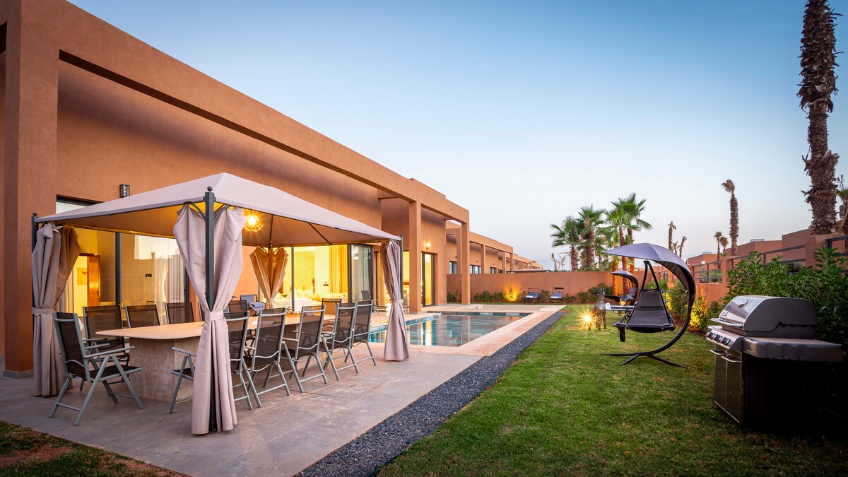 Kynntu þér villuna okkar á fallega Samanah-golfklúbbnum þar sem þú nýtur róar og næðis. Þessi 200 m² loftkælda eign er aðeins 15 mínútum frá miðborginni og flugvellinum og býður upp á margar veröndir, risastóran og einkagróðurskóg og einkasundlaug (upphitun er í boði ef óskað er eftir henni) með stórkostlegu sólsetri. Njóttu hins stórfenglega golfvallar sem hannaður er af Nicklaus og fuglanna. Upplifðu Beldi og marokkóskt andrúmsloft fyrir ógleymanlega dvöl. Öryggi allan sólarhringinn tryggir hugarró þína.