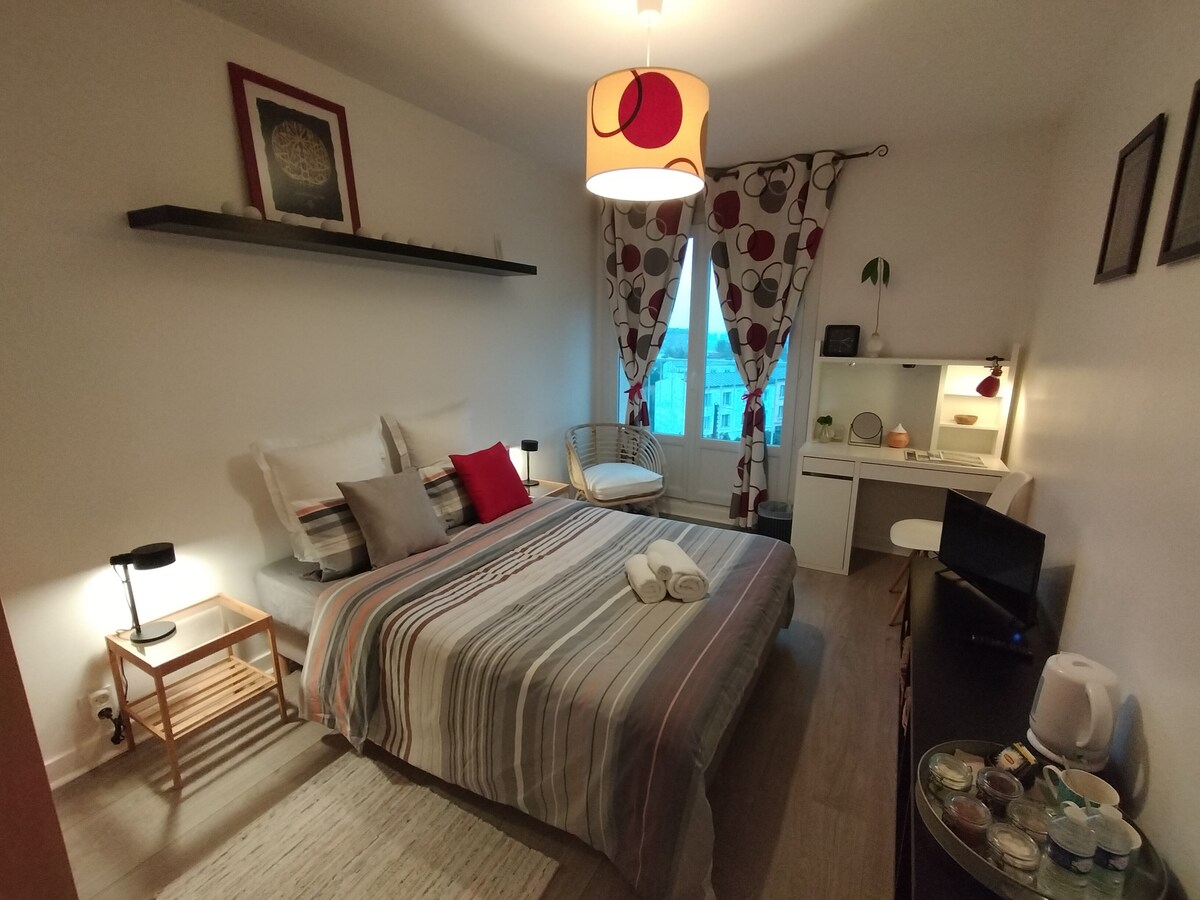 70 m2 íbúð á Quimper 5 mínútur frá sögulega miðbænum gangandi, 10 mínútur frá lestarstöðinni og hraðbrautinni. 15 mínútur frá ströndum með bíl. 2 svefnherbergi 140. Stofa 30 m2, uppsett og vel búið eldhús. Björt, ekki gleymast, fallegt útsýni. Merkimiði fyrir ferðamenn. Nákvæmni: 4. hæð án lyftu (breiðir og auðveldir stigar). Þráðlaust net. Handklæði og handklæði eru til staðar. Grunnkrydd (salt, pipar, krydd, edik, olía...). Loc mini 4 nights. Declaloc29232000086T6