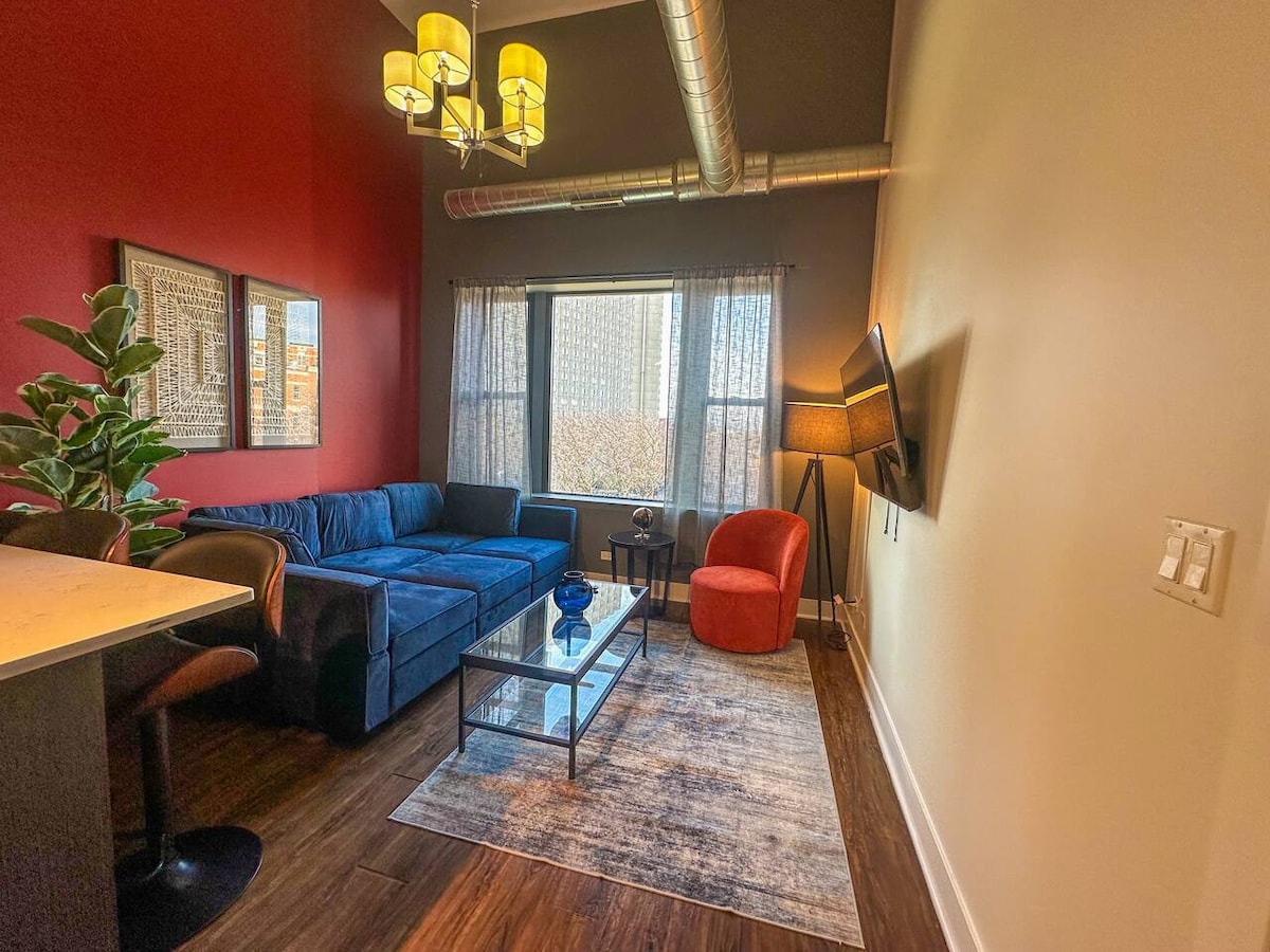 Upplifðu ekta Pilsen, líflega og listræna hverfi Chicago. Þetta nútímalega heimili með 2 svefnherbergjum og 1,5 baðherbergjum býður upp á fullkomna blöndu af þægindum og stíl aðeins nokkrar mínútur frá miðbænum, Kínahverfinu og McCormick Place. Njóttu ókeypis bílastæða við Loomis, einkabílastæða fyrir eitt hefðbundið ökutæki og valfrjálsra daglegra leyfa fyrir bílastæði nær. Kynnstu list, bruggstöðvum og veitingastöðum í næsta nágrenni.