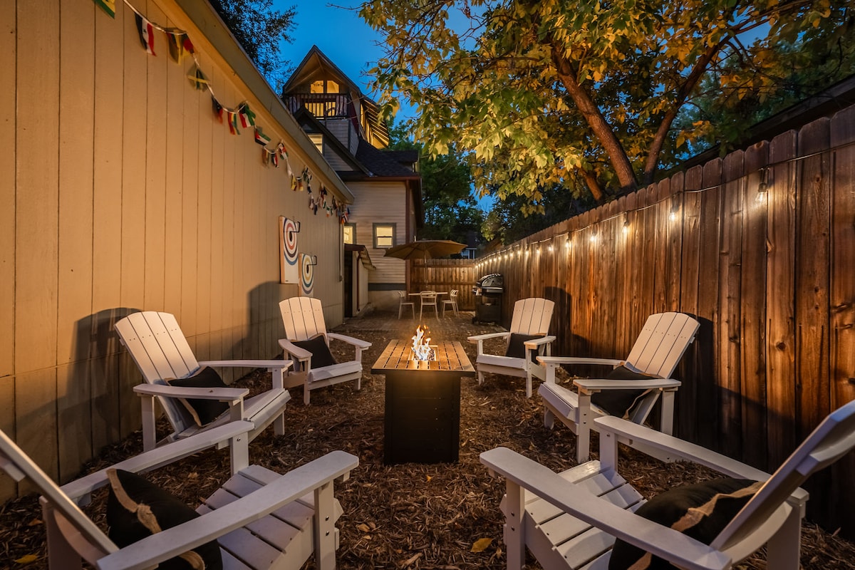 ✓STAÐSETNING: Walk to Switchback Coffee┃1.0 mi to Colorado College┃1.5 mi to downtown┃Short drive to Garden of the Gods, Pikes Peak, USAFA ✓ÚTIVIST: Sestu undir strengjaljósunum á afgirtri einkaverönd með reyklausu eldstæði og grilli ✓AFÞREYING: Kvikmyndaloft og stofa með Roku-sjónvörpum, hratt ÞRÁÐLAUST NET og leikir ✓UPPBÚIÐ ELDHÚS: Keurig, Chemex, vöffluvél, blandari o.s.frv. ✓FJÖLSKYLDUVÆN: Pack N Play, barnastóll, barnavagn, leikföng, skjáir +meira ✓Fjallaútsýni ✓ Innifalið gos á staðnum