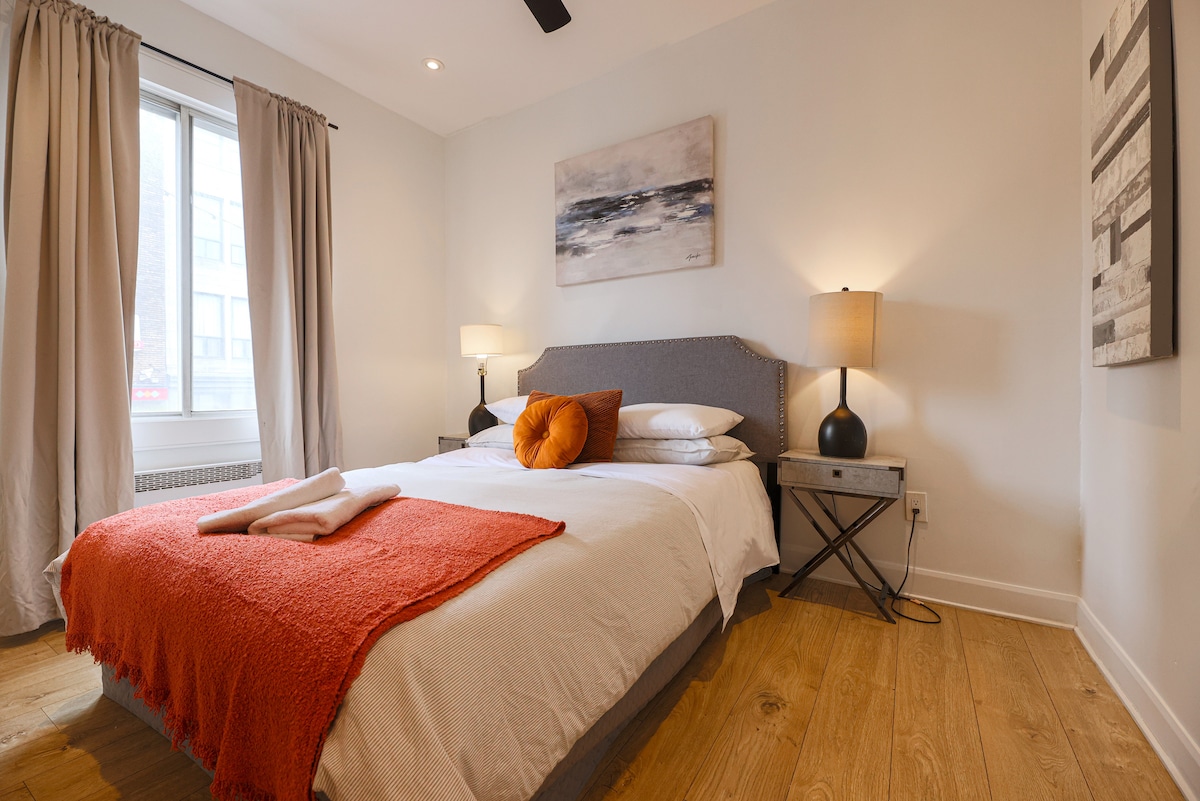 Verið velkomin í glæsilegu nútímalegu svítuna okkar í hjarta miðbæjar Montreal, steinsnar frá gömlu höfninni! Þessi glæsilega svíta er með fágaða hönnun með opnum hugmyndum, vönduðum áferðum og fullbúnu eldhúsi sem hentar fullkomlega fyrir heimilismat. Slakaðu á í lúxussvefnherbergjum með mjúkum rúmfötum og slappaðu af í glæsilegu stofunni. Upplifðu fullkomna blöndu af þægindum og spennu í borginni með vinsælum veitingastöðum, tískuverslunum og næturlífi við dyrnar!