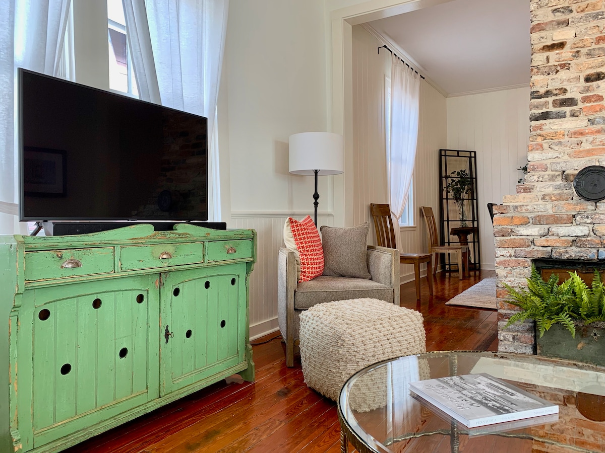 Falleg íbúð á fyrstu hæð í hinu sögufræga SR Moreno House frá 1908. Gestir eru með veröndina með ruggustólum til að njóta skyggða Live Oak tjaldhiminsins eða slaka á í bakgarði New Orleans með eldstæði, Kamado Joe, útisturtu og yfirbyggðu skemmtisvæði. Húsið er þægilega staðsett í blokkum frá veitingastöðum í miðbænum og America 's First Settlement Trail. Bílastæði er í innkeyrslunni með nægum bílastæðum við götuna fyrir aukabifreiðar.