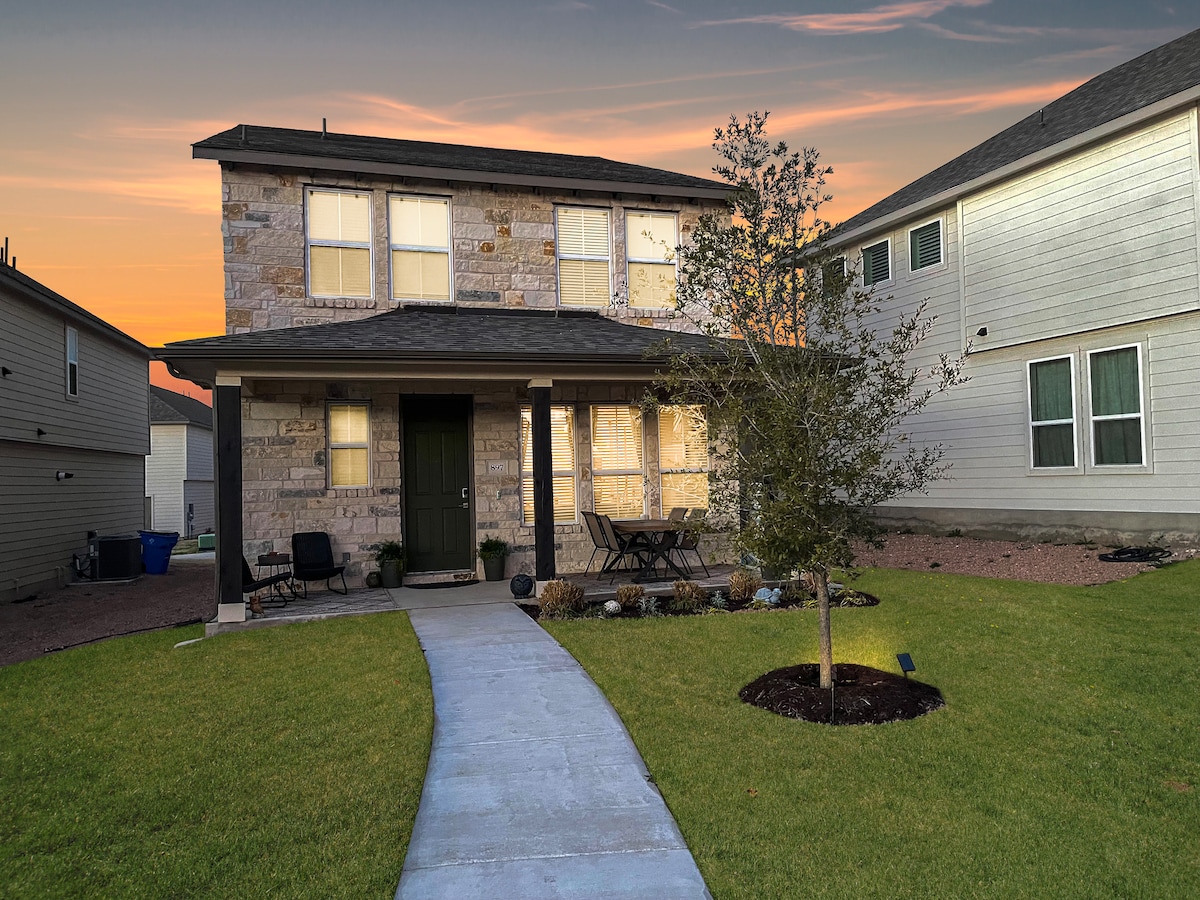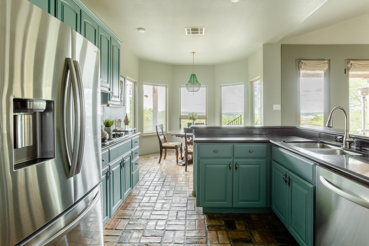 Stígðu út úr borgarlífinu, njóttu náttúrunnar á afskekktri verönd, njóttu útsýnisins og ríkulegs dýralífs! Sérsmíðað heimili okkar, innblásið af evrópskum uppruna, stendur hátt uppi á hæð og býður upp á kílómetra af útsýni og stórkostleg sólsetur. Staðsett miðsvæðis, 20 mínútna fjarlægð frá Austin, 20 mínútna fjarlægð frá Wimberley og nálægt mörgum brúðkaupsstöðum. Slakaðu á í hengirúmunum, drekktu kaffi á veröndinni eða gerðu jóga á svölunum. Andaðu að þér fersku loftinu og njóttu. Markmið okkar er að skapa ógleymanlega upplifun fyrir þig og deila okkar sneið af himni.