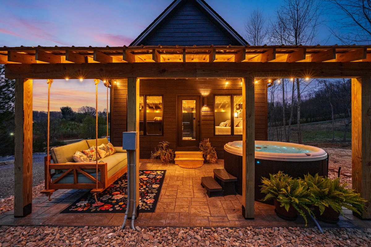 Ótrúlegt smáhýsi staðsett á 23 mjög einka hektara, þægilega staðsett rétt við aðalþjóðveginn. Þetta nútímalega stúdíó var nýlega byggt árið 2023 og býður upp á gríðarlegt magn af þægindum, þar á meðal fullbúið eldhús, tvöfaldar sturtur, heitur pottur, útisjónvarp, háhraða wifi, margar sjónvarpsáhorf, útiborð, grill, margar eldstæði, fjallasýn, mikið pláss fyrir stuttar gönguferðir eða náttúrugönguferðir, svæði með sólsetursútsýni aðeins skammt frá húsinu, aðeins 1,5 km frá almenningsgarði árinnar.