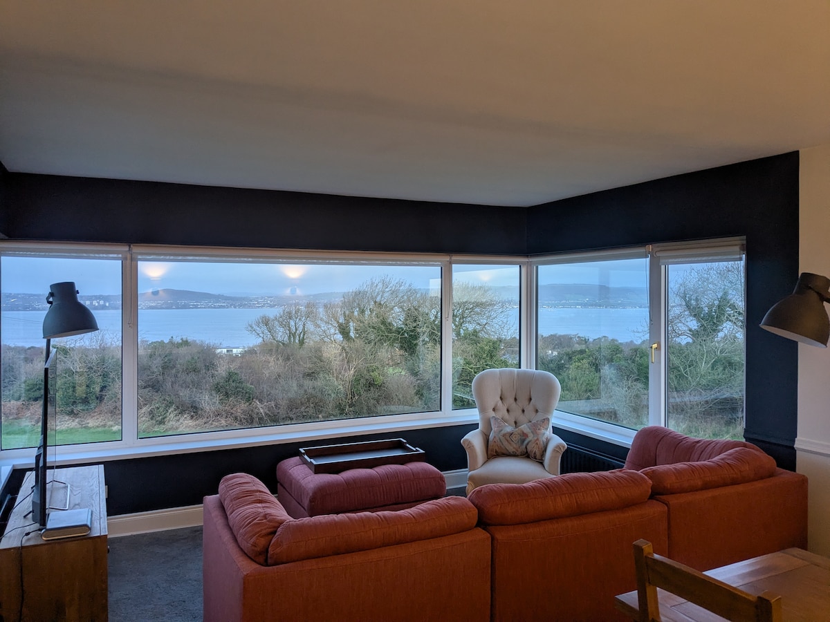 Fullkomið frí við vatnið allt árið um kring fyrir tvo. Við vatnsbakkann er útsýni út á sjó, fjöll og yfirgripsmikið útsýni. Aðeins 5 mín akstur frá stórum markaðsbæ og 20 mín til Belfast borgar. Hundavænt. Nálægt leiðandi golfvöllum. Stílhreint. Hvelfd loft, gluggar frá gólfi til lofts, dyr opnast út á stóra verönd sem snýr í suður fyrir drykki við sólsetur eða grillaðstöðu og svalir frá hjónasvítu. Sæti utandyra til að kæla eða borða. Viðareldavél í stofunni.