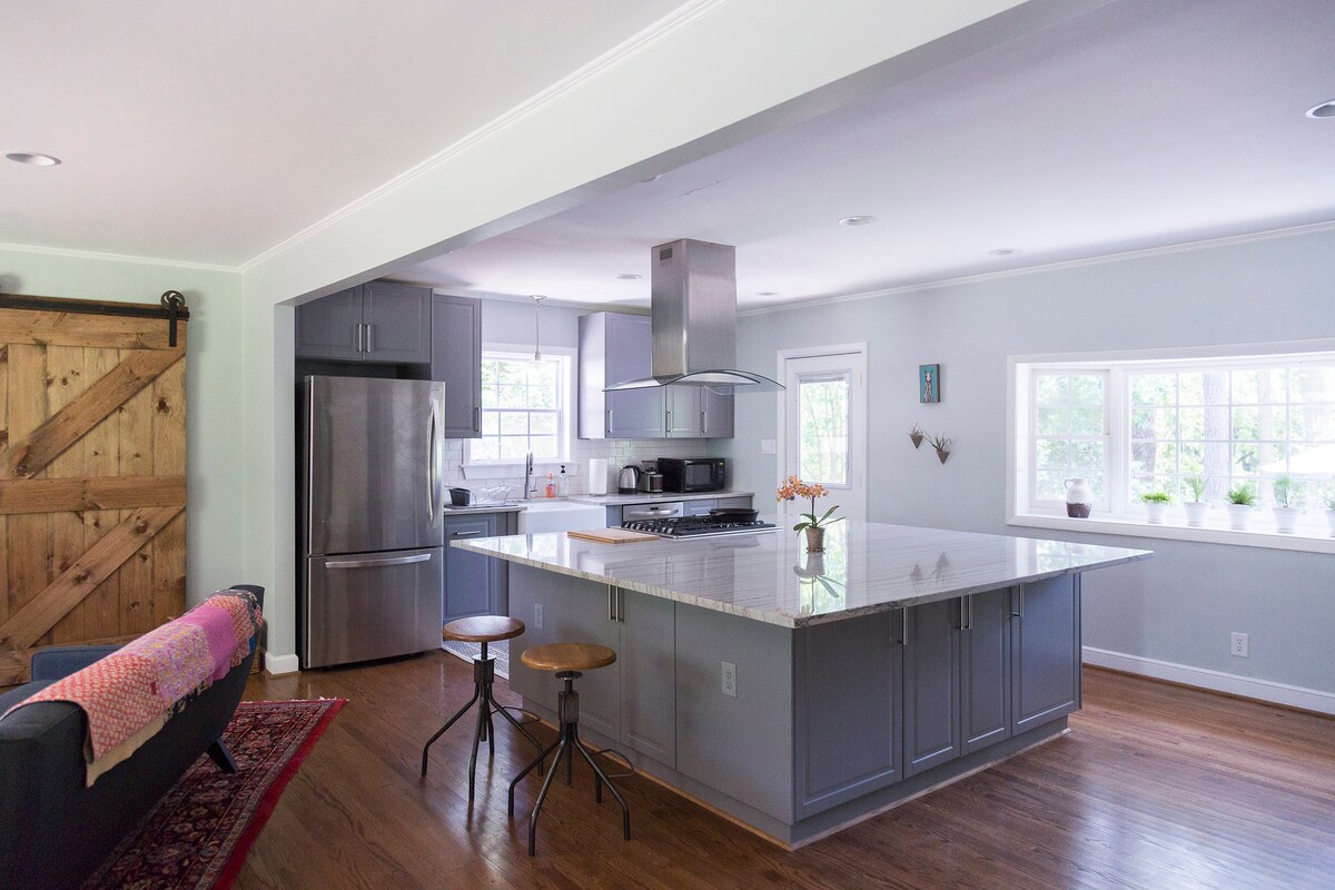 Allur hópurinn fær greiðan aðgang að öllu frá þessum miðlæga fjársjóði í sögufræga Durham! Heillandi heimili mitt hefur verið endurreist að fullu í sögulega fortíð með nútímalegum uppfærslum! Hún hefur verið vandlega hönnuð, smekklega innréttuð og er þægilega staðsett fyrir ferðamenn sem heimsækja Durham eða önnur svæði í nágrenninu vegna tómstunda og vinnu. Á þessu einsögu heimili eru 3 svefnherbergi og 2,5 baðherbergi með stóru fullfrágengnu háalofti með öllum þægindum fyrir gesti og plássi sem þú þarft til að njóta dvalarinnar!