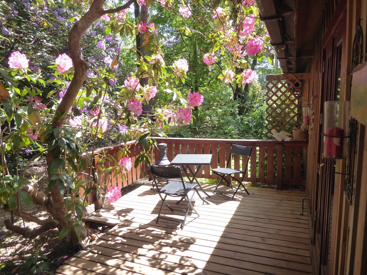 Eyddu dögunum í notalegum timburkofa umvafinn rhododendronum. Með viðareldavél, garði og verönd ertu viss um að hafa það sem þú þarft fyrir afslappandi dvöl. Farðu út um garðhliðið og þú ferð inn í Ringwood Forest með hjólastíg, Moors Valley Country Park, golfvöll og stöðuvatn. Í 5 mín akstri er ekið til hins sögufræga markaðsbæjar Ringwood. Farðu austur og skelltu þér í fallega þjóðgarðinn New Forest eða farðu suður að sandströndum Bournemouth.
