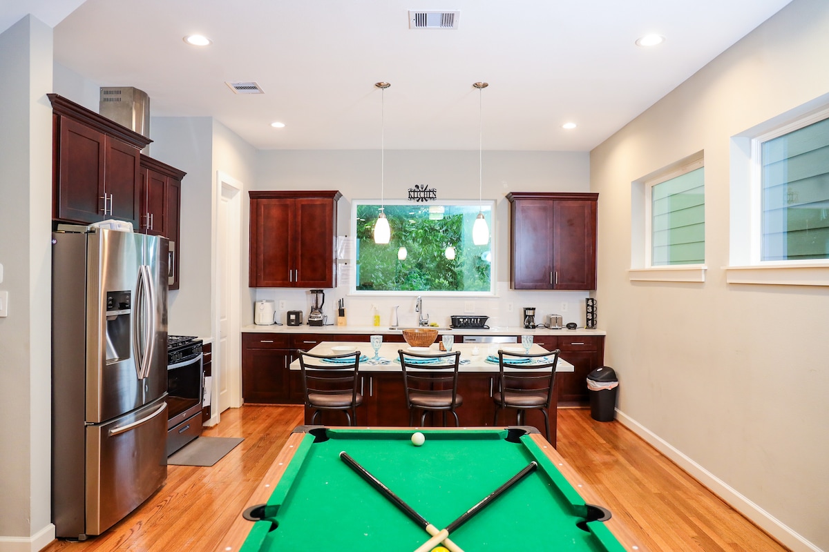 Þetta nútímalega heimili er staðsett í einu af miðlægustu hverfum Houston og býður upp á einstaka blöndu af gamaldags stemningu og nútímalegum þægindum. Þetta er fullkomið rými til að upplifa Houston eins og heimamenn. Njóttu friðhelgi og hugarróar í fullgriðinni eign þar sem við erum staðráðin í að gera dvöl þína þægilega og ógleymanlega. Hvort sem þú ert hér til að slaka á, skoða eða bæði, er þetta heimili fullkominn upphafspunktur fyrir ógleymanlegt ævintýri!“