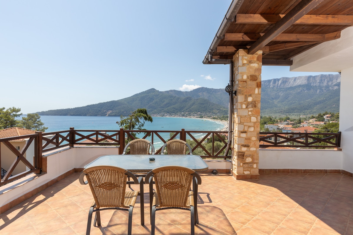 Staðsett í hefðbundnu þorpi Theologos ,Thassos. LINόS er staðsett nálægt miðju þorpsins en í burtu frá hávaða, mun það sanna friðsæla gistiaðstöðu. Það er aðeins í 10 km fjarlægð frá sjónum og það þýðir 10 mínútna akstur í gegnum yndislegan veg umkringdur furutrjám. 720m2 hluti eignarinnar veitir fjölskyldu þinni hugarró og ró. Ef þú átt GÆLUDÝR verður þetta fullkomið hús fyrir þau því öll eignin er umkringd steinvegg með girðingu.