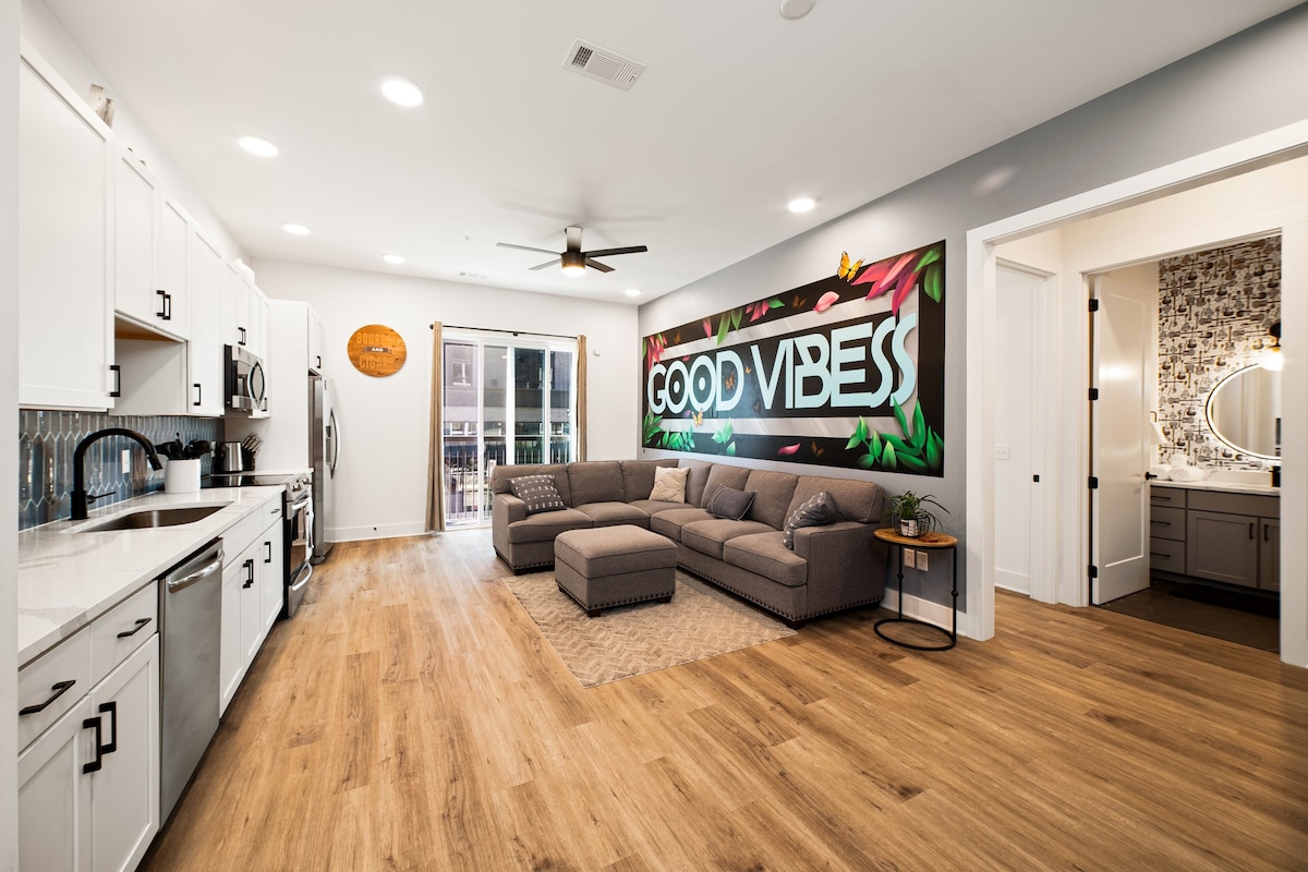 Ready to party in the heart of Nashville? Our bold black and gold 1BR is just steps from Broadway, Honky Tonk bars, and the Gulch! Pre-game with games, stream your favorites on two 50" TVs, and vibe out with fast Wi-Fi. Walk to the hottest bars, live music, and restaurants. Perfect for a wild weekend, birthday bash, or friends' getaway. Live, laugh, and make memories right where the action is! Permit #2022059164