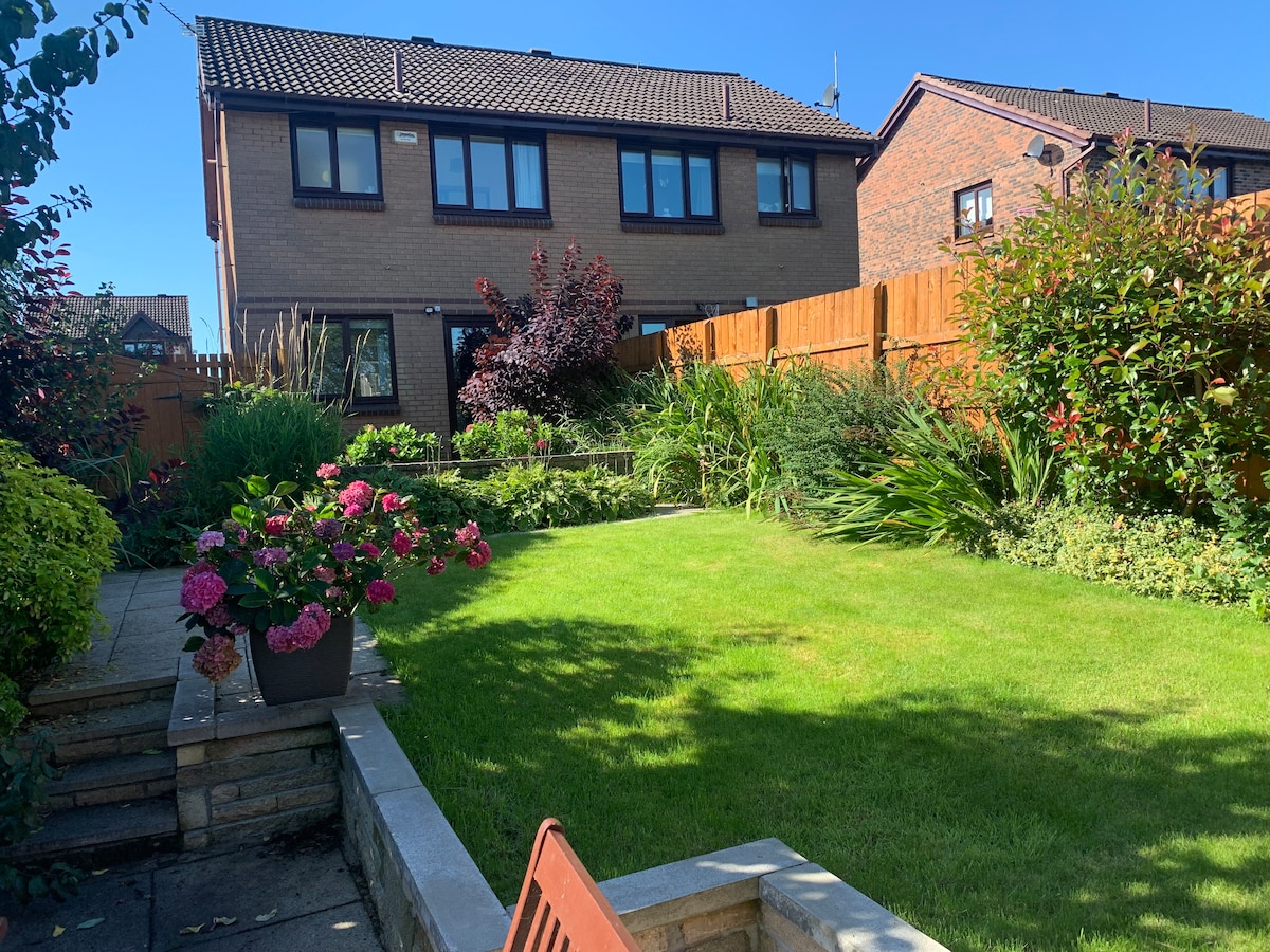 Verið velkomin á fallega þriggja herbergja heimilið okkar sem hentar vel fyrir fjölskyldur eða hópa. Hjónaherbergið er með sérbaðherbergi með tveimur baðherbergjum til viðbótar fyrir þægindi og þægindi. Njóttu rúmgóðrar stofu, fullbúins eldhúss og stórs garðs sem er tilvalinn til að slaka á eða borða utandyra. Eignin býður einnig upp á tveggja bíla einkainnkeyrslu sem tryggir auðvelt að leggja. Þetta heimili er stílhreint, notalegt og vel staðsett og er fullkomið afdrep fyrir dvöl þína á Airbnb.