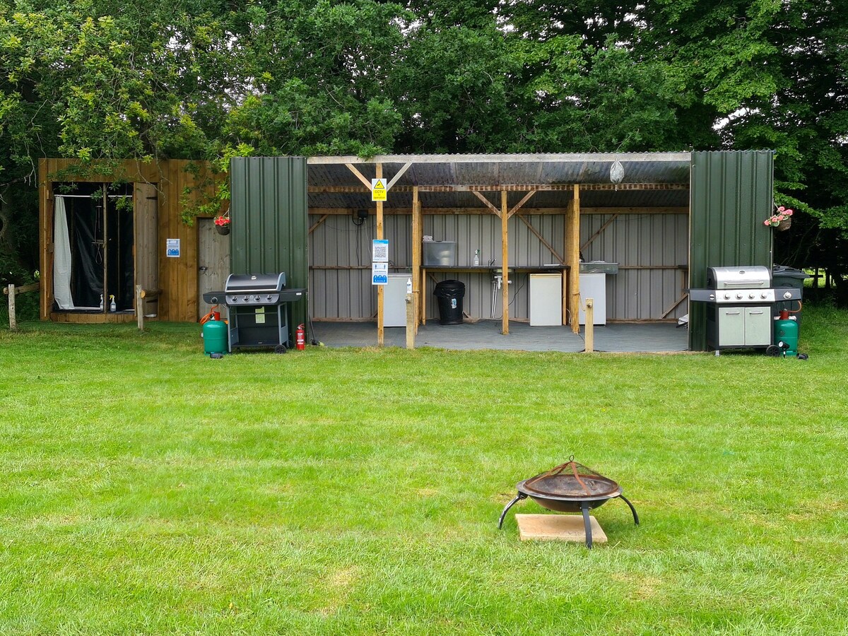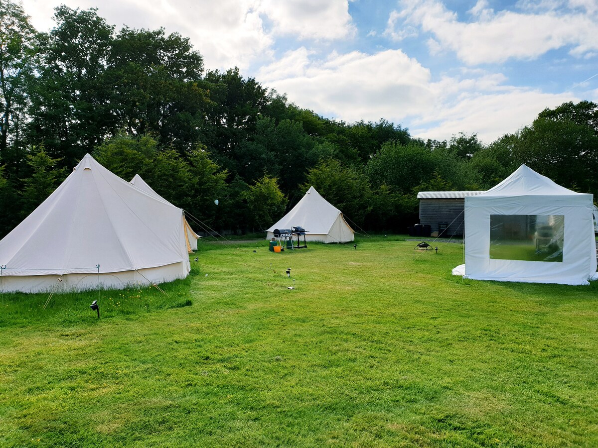Tibbs Farm, eitt af þremur 5 metra bjöllutjöldum í hjarta vinnubýlis okkar í gamla eplagarðinum okkar. Fallega býlið okkar fyrir gaffal er í 10 mínútna göngufjarlægð frá tjöldunum með góðum morgunverði, bragðgóðum hádegisverði, góðu kaffi og heimabökuðum kökum. Með drykkjarvatni, einkasalerni utan nets og sveitalegri, upphitaðri sturtublokk fyrir utan. Athugaðu að handklæði eru ekki til staðar. Tjöldin okkar eru laus yfir sumartímann. Athugaðu: Við erum vinnubýli með búfé.