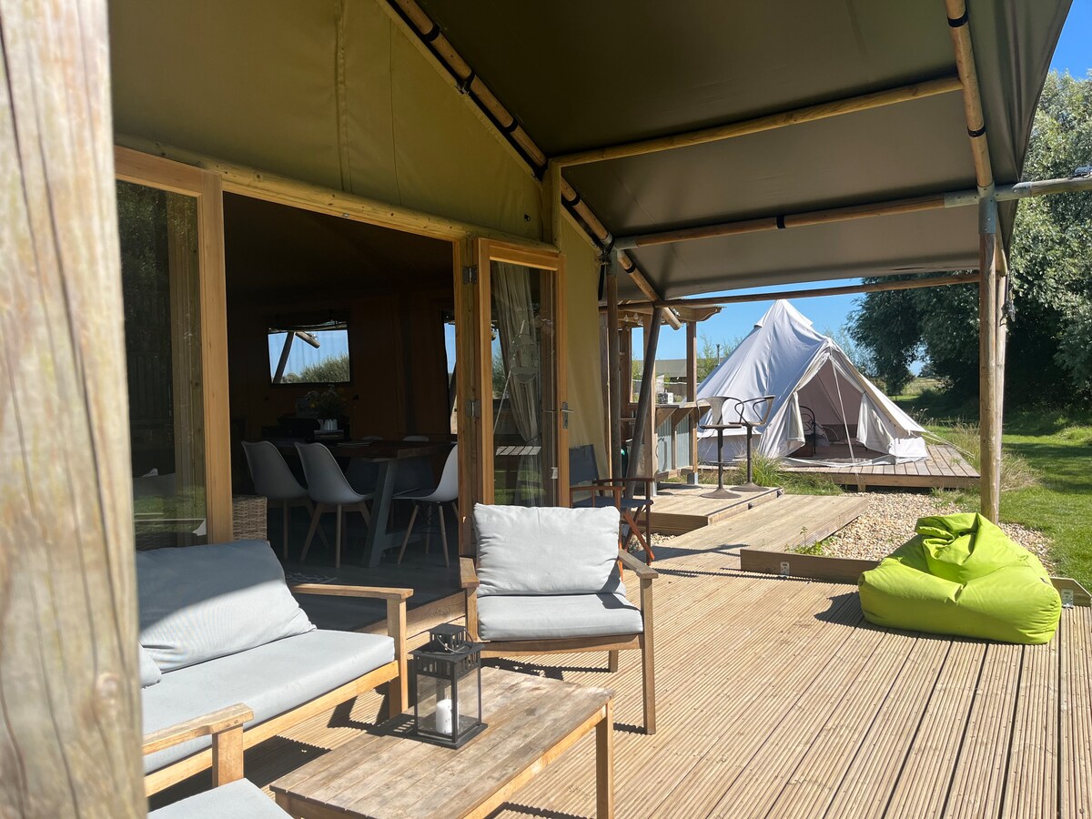 Fallegur og kyrrlátur staður með mögnuðu útsýni, náttúru og sólsetri. Wheatfields er með tveimur einkatjöldum í lúxus Safari-stíl með 60 m millibili. Tjöldin bjóða upp á sveigjanlega gistingu fyrir fjölskyldur eða vini með Bell Tent innifalið. Nýr heitur pottur fyrir 2025. Nútímalegar innréttingar, einstaklingsbundnar lúxussturtuherbergi. Fullbúið eldhús, hágæða rúmföt og handklæði. Viðareldavél. Stutt að keyra til sögulega bæjarins Rye og frábærra stranda. Aðeins tvær klukkustundir frá London og þú getur komið með hundinn þinn líka