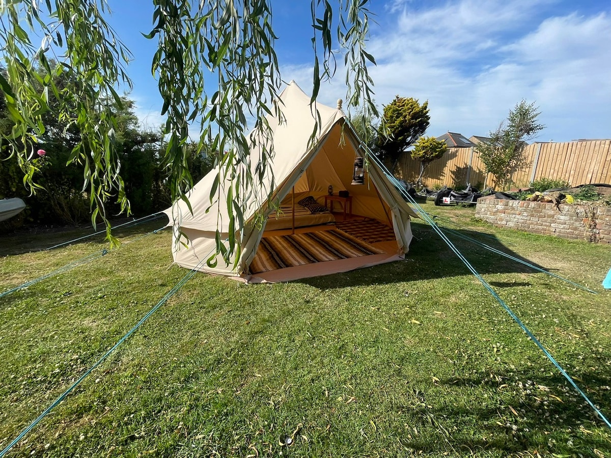 Í tveggja mínútna göngufjarlægð frá Camber Sands ströndinni er 4 metra bjöllutjaldið okkar fullkomið friðsælt frí til að endurbyggja. Lúxusútilega í fallegu umhverfi! Nóg pláss fyrir jóga eða pilates. Sögufræga rúgbrauðið er í 5 mínútna akstursfjarlægð eða í 20 mínútna akstursfjarlægð. Þetta tjald er í stóra fjölskyldugarðinum okkar, við erum einnig með flugbrettaskóla, rafhjóla- og hjólaleigu, SUP og kajakleigu á staðnum. Það eru USB-hleðslutengi fyrir þig á staðnum.