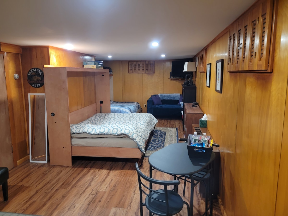 Rúmgóð kjallaraíbúð nógu stór fyrir 3 manns, þar á meðal svefnherbergi, stofu, stóran fataherbergi, minni aukaskáp, eldhús og 75 tommu 4K sjónvarp. Staðsett á Sedgwick-svæðinu, í 10 mínútna fjarlægð frá flugvellinum í Syracuse, í 7 mínútna fjarlægð frá Syracuse-háskóla og miðbæ Syracuse. Húsið er staðsett í rólegu og öruggu svæði. ganga og gæludýravænt hverfi. Íbúðin er loftkæld, mjög hratt WiFi er einnig í boði fyrir notkun þína, hlakka til að sjá þig!
