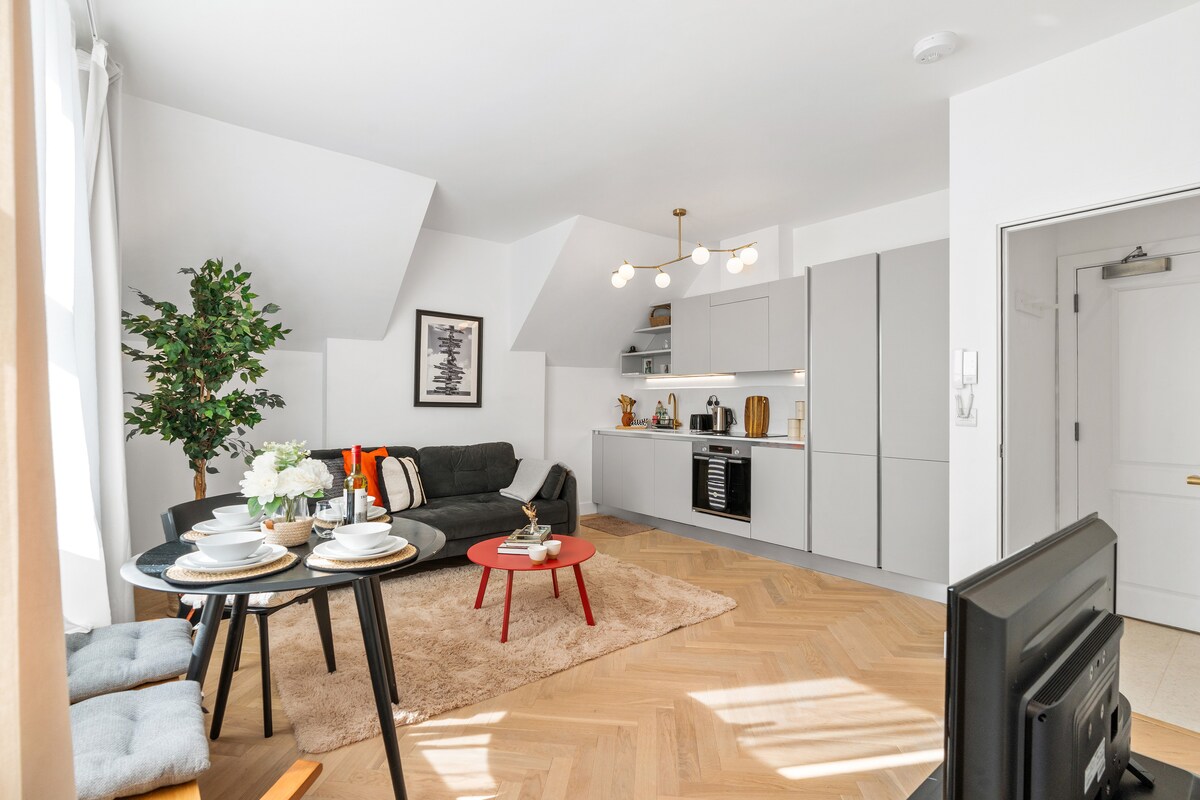 Nýuppgerð loftíbúð frá Viktoríutímanum sem hentar fullkomlega fyrir gistingu á Sunshine Coast. Með betri innréttingum, almenningsgarði á móti og úrvali af aukahlutum og þægindum ættir þú að hafa allt sem þú þarft fyrir frábæra dvöl. Við búum í íbúðinni hér að neðan ef þú þarft á einhverju öðru að halda. Ókeypis bílastæði á veginum. Aðgangur að stafrænum lyklakóða, næturljós og öryggismyndavél við innganginn. Göngufæri frá öllu því sem Eastbourne hefur upp á að bjóða. Innifalið góðgæti fyrir gesti og hundafjölskyldumeðlimi