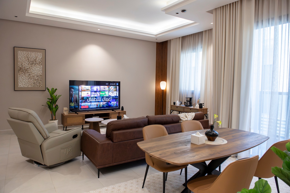 Lúxus íbúð í Morden í Al Khobar Stílhrein gisting sem sameinar þægindi og lúxus. Eiginleikar íbúðarinnar: • 2 svefnherbergi með þægilegum dýnum • Salur með 75 tommu snjallsjónvarpi • Netflix og Watchvip áskrift • Sjálfsafgreiðsla • Þrífðu baðherbergi með nauðsynjavörum Tilvalin staðsetning: • 3 mín. frá Barein-brúnni • 5 mín. af Al Khobar Corniche • 10 mín frá Al Rashed Mall • 15 mínútur frá Haff Moon • Nálægt Ajdan Walkway Wook og Al-Daghir Island
