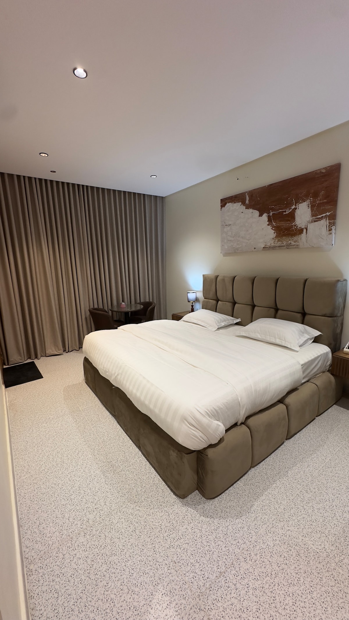 Uppgötvaðu einkennandi dvöl í þægilegri íbúð í borginni Al Khobar. Íbúðin státar af nokkrum eiginleikum: 1. Snjallt og öruggt aðgengi í gegnum snjalldyralás. 2. Fallegar svalir með útsýni. 3. Kaffihorn með kaffivél, örbylgjuofni og litlum ísskáp. 4. 4K snjallskjár. 5. Hröð 5G nettenging. 1. Barein brúin - innan 5 mínútna. 2. Rashid Mall - 10 mínútur. 3. Við vatnið - 5 mínútur.