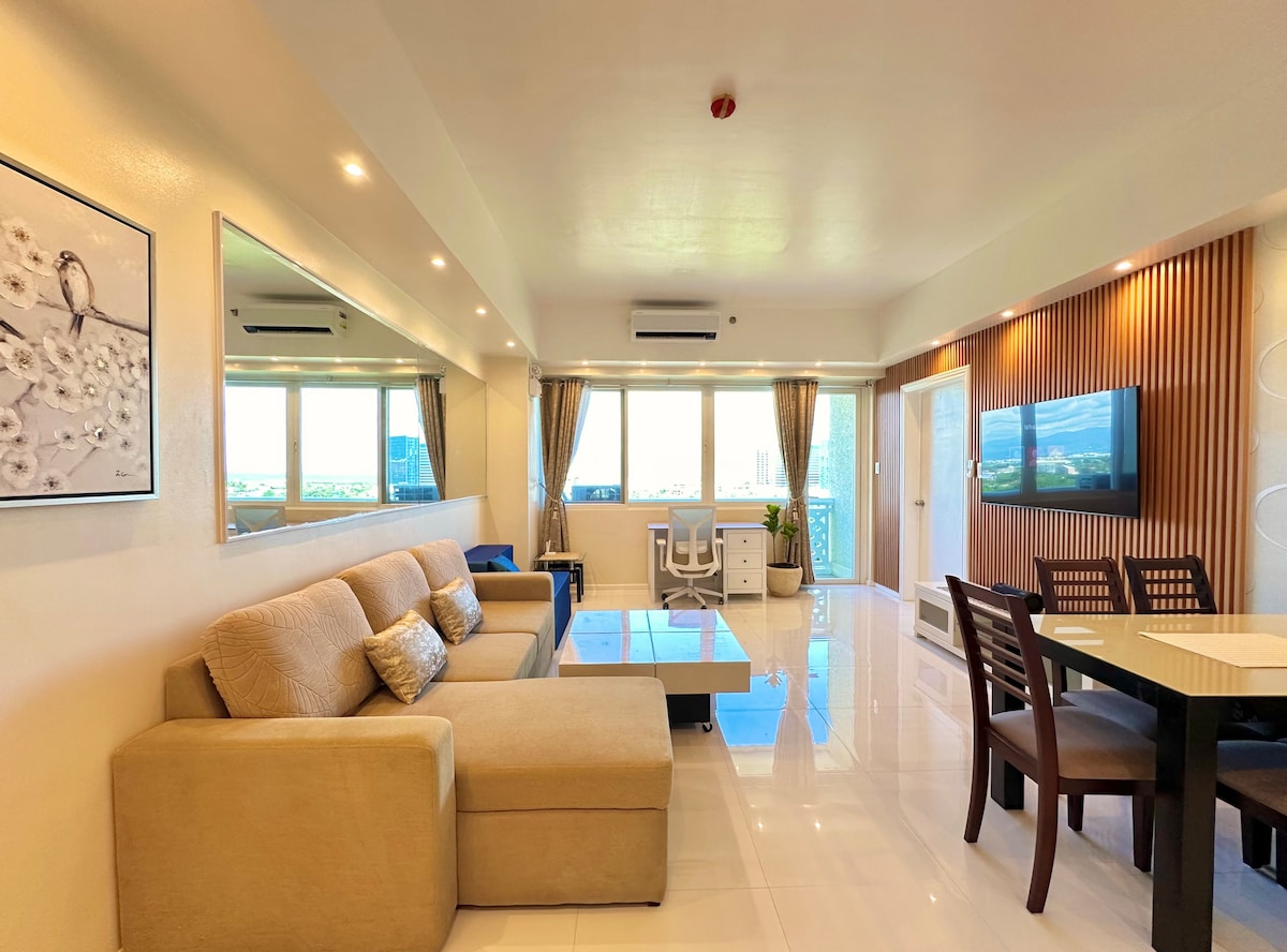 Þessi íbúð er fullkomin fyrir íburðarmikla dvöl með vinalegri og kurteisri þjónustu frá japönskum starfsmönnum. Það er svefnherbergi með einu queen-size rúmi, aðskilið frá stofunni. Gestir sem gista í viku eða lengur hafa ókeypis aðgang að sundlaug dvalarstaðarins, ströndinni og ræktarstöðinni. Þessi takmarkaða þjónusta er í boði eftir því sem hún kemur. Hægt er að fá bíl með bílstjóra. Þráðlaust net er ókeypis en við getum ekki ábyrgst fullan aðgang vegna óstöðugra innviða á Filippseyjum. Venjulega er þetta ekkert vandamál.