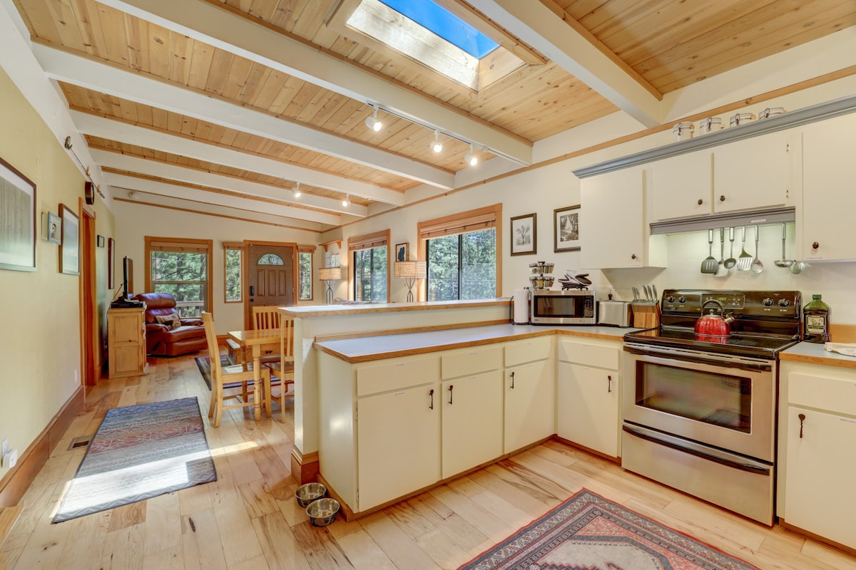 Þetta er A-laga kofi á trjám á meðal háu furutrjánna í High Sierras í Norður-Kaliforníu. Í 5.000 feta hæð er fullkomin umgjörð fyrir frábært fjallafrí. Það er sveitalegt andrúmsloft í kofanum og hann er innréttaður með úthugsuðum smáatriðum. Það er afskekkt en í nokkurra mínútna fjarlægð frá matvörum, veitingastöðum, ánni og einu dýrmætasta tré jarðar, Sequoias.