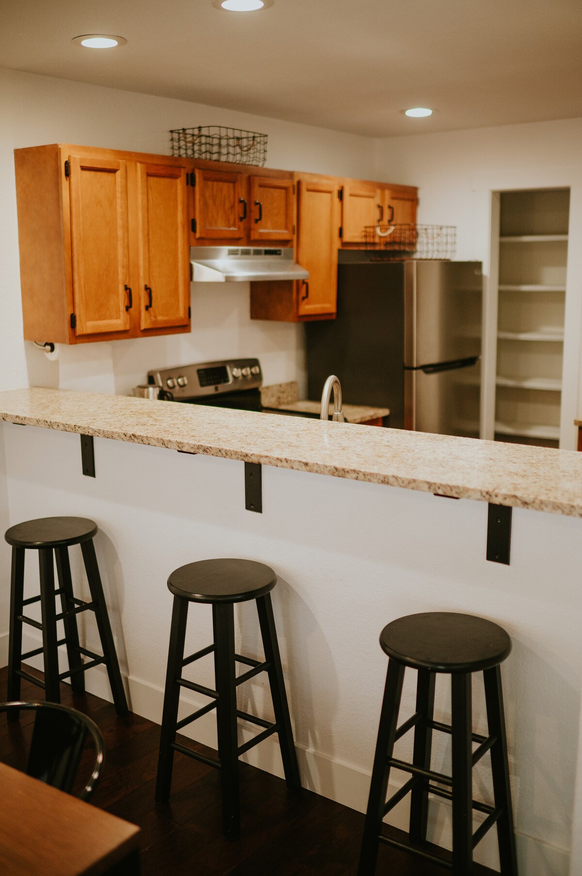 Rúmgóð opin hæð með 4 svefnherbergjum og 2 baðherbergjum sem staðsett er í einni blokk við 285. Miðsvæðis 1/2 húsaröð frá matvöruverslun, CVS, veitingastöðum og bensínstöðvum. Heimilið er fullt af sérsmíðuðum listaverkum mínum sem eru til sölu. Ég býð upp á ýmis þægindi fyrir alla fjölskylduna að njóta. Rúmgóður afgirtur bakgarður með própangrilli fyrir þá sem elska að grilla. Það er nóg pláss fyrir börnin að leika sér. Pecos áin er í nokkurra húsaraða fjarlægð þar sem þú getur notið strandarinnar eða vatnagarðsins.