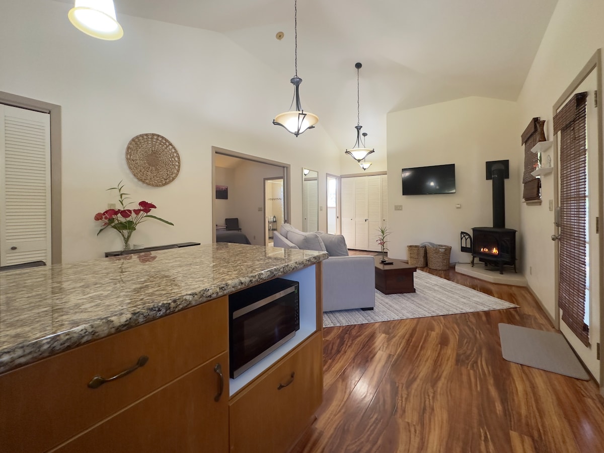 Þessi kyrrláta fjallaafdrep býður upp á kyrrð og ró í dreifbýli nálægt eldfjallaþjóðgarði Havaí. Einkaheimilið er þakið lanais til einkanota með matarsvæðum, afslöppunarsvæðum og eldstæði. Innanhúss er einstök havaískstemning með fáguðum innréttingum. Myndaðu glugga á bakhlið hale sem veita óslitið útsýni inn í regnskóginn. Fullbúið kokkaeldhús er fullkomið pláss til að útbúa fjölskyldumáltíðir.