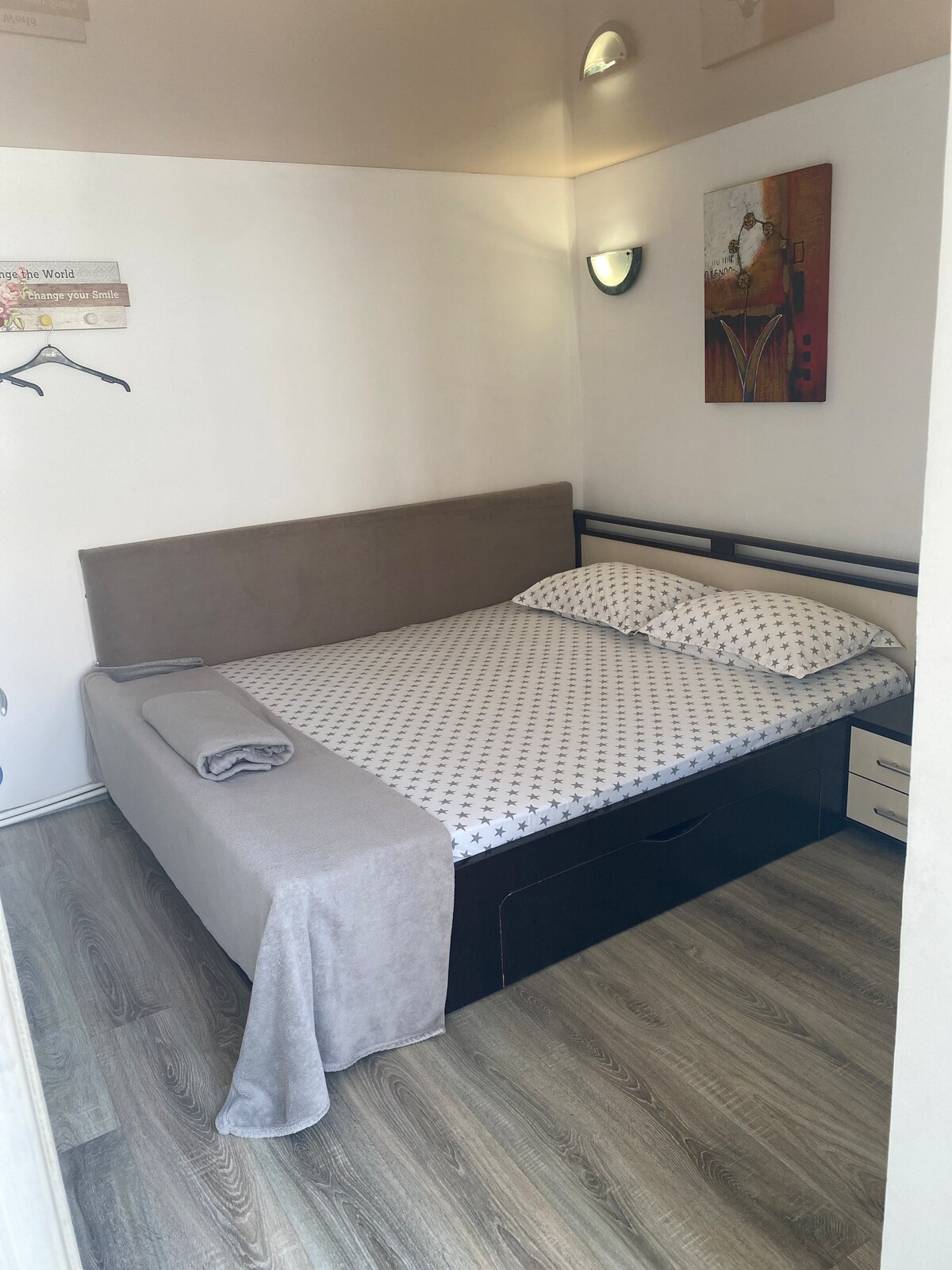 The room is small and intimate, with parquet, the size of the room is 3x3 and the bathroom is 3x1.60 meters! room 1 and room 2 are located upstairs and have a common terrace with sofas, tables and sun loungers! On the ground floor there is a large kitchen equipped with everything you need and a large terrace with sofas and tables in front of a 250 meter garden with lawn and flowers and 2 swings! Rooms 1 and 2 are air conditioned! The distance to the city center is 5 minutes walk !