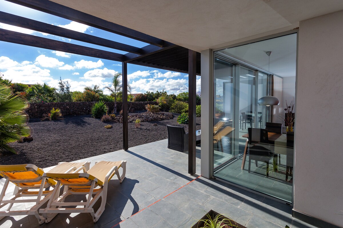 Frábær íbúð sem er 71 m2 og 40 m2 einkagarður með hengirúmi, stóru borði og grilltæki með plássi fyrir 4 gesti. Tilvalið fyrir fríið eða fjarskiptadvölina. Þéttbýlismyndunin er með mjög stóra einkasundlaug sem er tilvalin til að kæla sig niður eða synda meðan á dvölinni stendur. Íbúðin er staðsett á fallegum stað í Dunes of Corralejo.