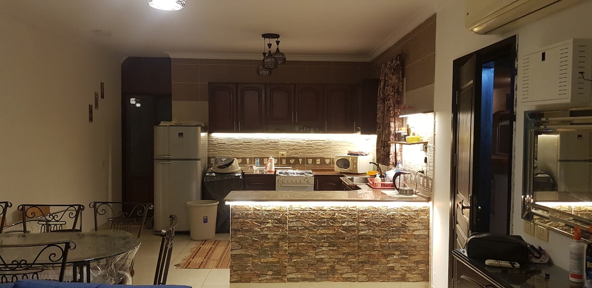 Fallegt frí í aðeins 2 klst. fjarlægð frá Kaíró... Magnað strandhús við Rauðahafið inni í afgirtu fjölbýli. Einkaströnd er í 10 mínútna göngufjarlægð frá húsinu og sundlaugin er í 3 mínútna göngufjarlægð. Húsið er fullbúið með fullbúnu eldhúsi, þvottavél, interneti og snjallsjónvarpi. Nálægt ofurmarkaði og apóteki sem hægt er að komast í gegnum golfbíl. Bóka þarf að minnsta kosti 2 nóttum fyrir fyrirhugaða dvöl. Eignin er aðeins í boði fyrir fjölskyldur og ferðalanga sem eru einir á ferð. Þjálfuð gæludýr eru velkomin.