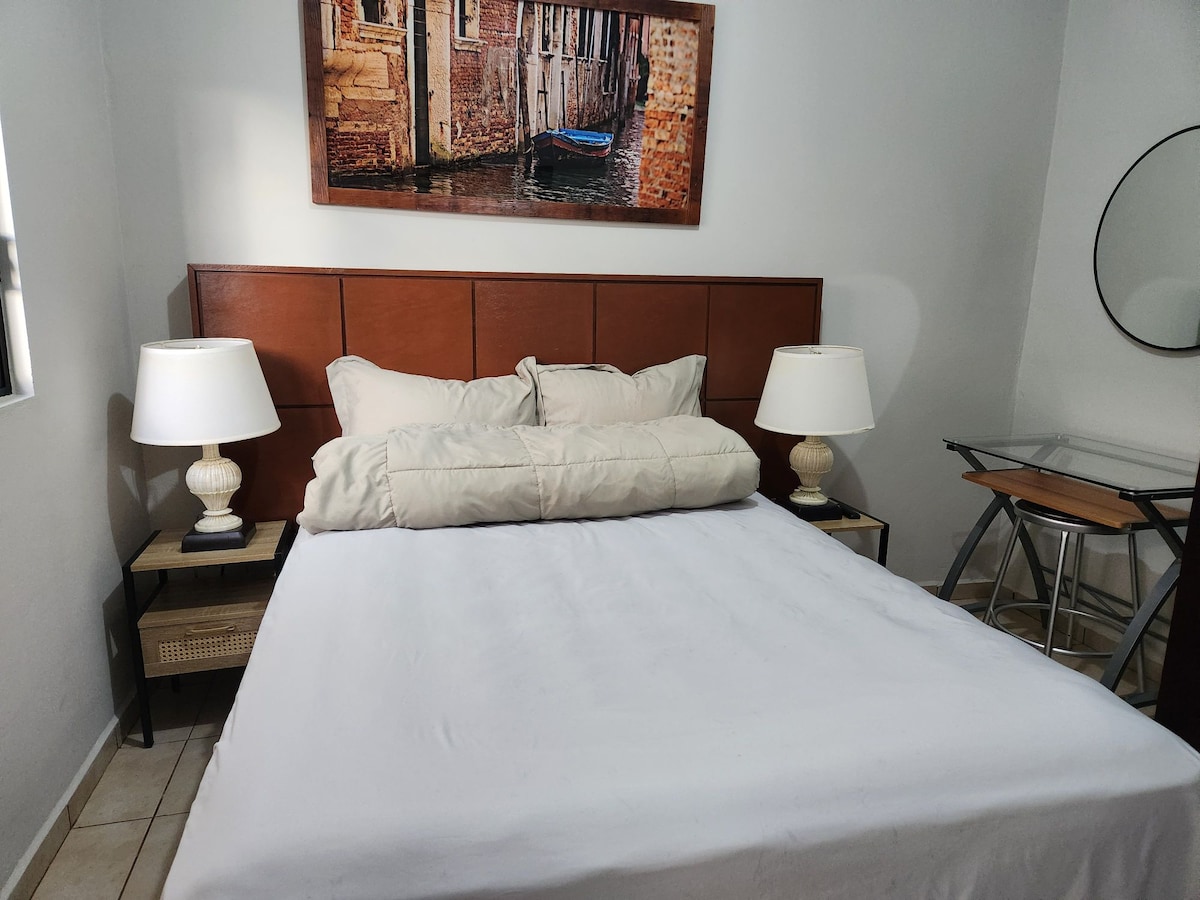 Innréttað stúdíó, miðbær og rólegt svæði, bílastæði á sömu götu eða við hliðina. Með loftkælingu, loftviftu, þráðlausu neti, Roku-sjónvarpi, ísskáp, örbylgjuofni, kaffivél, brauðrist, eldavél, diskum, vaski, hnífapörum og nauðsynlegum eldunarvörum og þjónustuverönd með þvotti. 10 mínútna göngufjarlægð frá miðbæ San Jose, 5 mínútna akstursfjarlægð frá verslunarmiðstöð, strönd og ferðamannasvæði. Auðvelt og skjót aðgengi að aðalvegum og almenningssamgöngum.