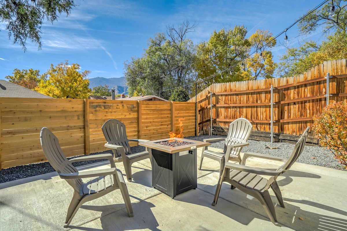 Glæsilegur bakgarður er fullgirtur. Njóttu næturinnar í kringum eldinn eftir stóran dag í skoðunarferðum eða slakaðu á í hengirúmsstól sem dreymir um skipulag næsta dags! Húsið er alls ekki risastórt en notalegt, útbúið með þægilegum og fallegum innréttingum og innréttingum og hefur allt sem þú þarft til að eiga frábæra dvöl í CO Springs. 5 mínútur í frábært mtn-hjól í Palmer Park 12 niður í bæ eða gömlu Kóloradó-borg 14 to Garden of the Gods, 20 to Manitou Springs 5 to UCCS , 8 to Colorado College STR-2297