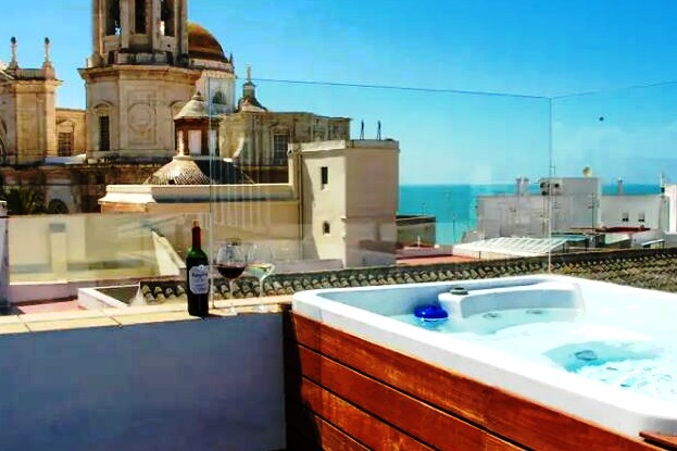 Stunning 2 bedroom apartment with FULL BEDS in the heart of Cádiz. Two large private terraces & jacuzzi where to relax enjoying amazing views of the Cathedral Bright and airy penthouse set in a new building with marble floors & cozy decoration. Centrally located at Plaza de la Catedral and Market. Many restaurants and shops around Beach: 10 minutes away. Parking available at AV CAMPO DEL SUR, 15 COST: 15 eu/day