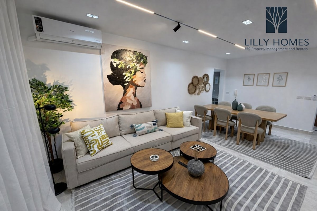 🌿 Welcome to your peaceful escape! 🌿 • 🛏️ 2 serene bedrooms + calm reception, ideal for families or friends • ❄️ Air conditioning for cool comfort on warm days • ✨ Soothing decor & cozy vibe that feels just like home • 🌳 Tranquil garden view to unwind & relax • ☕ Peaceful balcony to start your mornings right • 🛍️ 5 mins from Rehab Mall, The Market & Food Court • ✈️ 15 mins from Airport